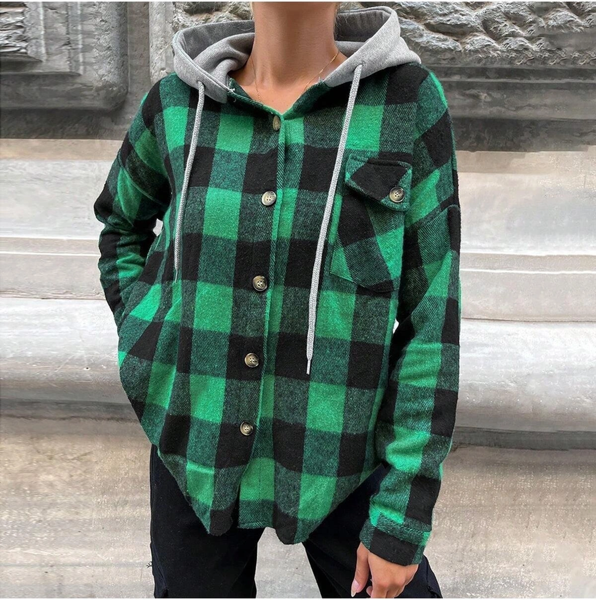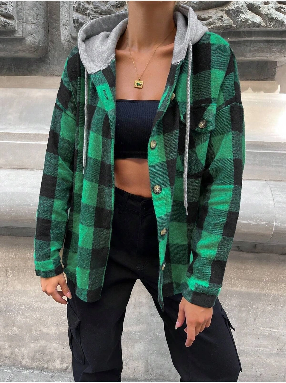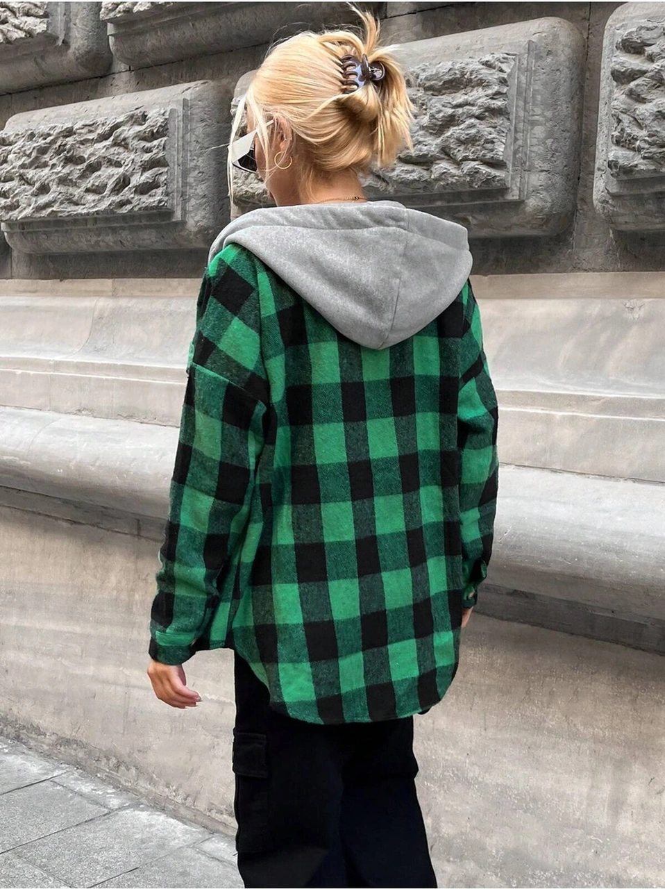 Kadın Desenli Renkli Oduncu Oversize Bol Ve Geniş Kalıp Casual Çift Kapüşonlu Ceket Gömlek Yeşil