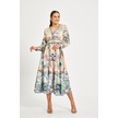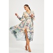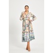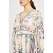 Kadın Desenli V Yaka Elbise Uzun Kollu, Kuşaklı, Astarlı Bej