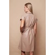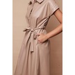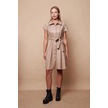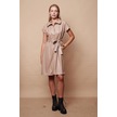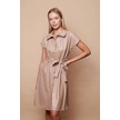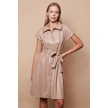 Kadın Hafif Likralı Ekolojik Deri Yakalı Düşük Omuzlu Yan Cepli Düğmeli Diz Boy Elbise-bej Bej