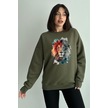 Kadın Haki Aslan Baskılı Oversize Bisiklet Yaka Sweatshirt Haki