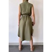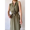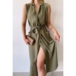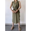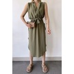 Kadın Haki Kalın Askılı, Kruvaze Yaka, Düz Desen, Aerobin Yırtmaçlı, Kemerli Midi Elbise Haki