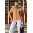 Kadın Hardal Çizgili Desen, Dokulu Bodrum Kumaş, Kolsuz Rahat Gömlek HARDAL