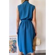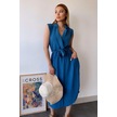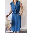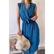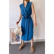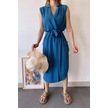 Kadın İndigo Kalın Askılı, Kruvaze Yaka, Düz Desen, Aerobin Yırtmaçlı, Kemerli Midi Elbise Indigo