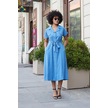Kadın İpeksi Modal Kumaş Yakalı Düşük Omuzlu Apoletli Yan Cepli Kemerli Diz Altı Boy Uzun Elbise-indigo Indigo