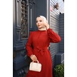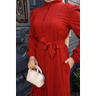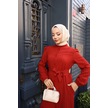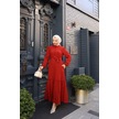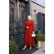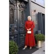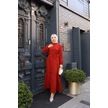Kadın Kiremit Boydan Düğmeli Eteği Piliseli Kuşaklı Lara Keten Uzun Tesettür Elbise Kremit Kiremit