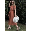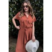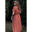 Kadın Kiremit Kısa Kol, Gömlek Yaka, Düz Desen, Çift Cepli, Aerobin Kumaş, Kuşaklı Maxi Elbise Kiremit