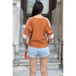Kadın Kiremit Omuz Dekolteli Kısa Kol, Salaş Keten Bluz Kiremit