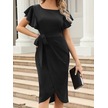 Kadın Kısa Fırfır Kollu Yakası Açık Belden Kuşaklı Çapraz Kesim Detaylı Ithal Krep Elbise Siyah