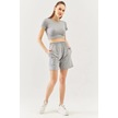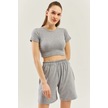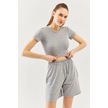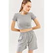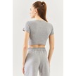 Kadın Kısa Kol Bisiklet Yaka Vücuda Oturan %100 Pamuklu Kaşkorse Esnek Crop Bluz Açık Gri