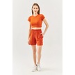 Kadın Kısa Kol Bisiklet Yaka Vücuda Oturan %100 Pamuklu Kaşkorse Esnek Crop Bluz Kiremit