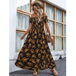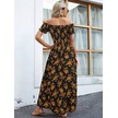 Kadın Kısa Kollu Madonna Yaka Yırtmaçlı Çiçek Desenli Süprem Elbise Siyah