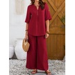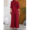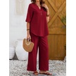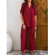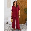 Kadın Kısa Kollu V Hakim Yaka Düğmeli Bürümcük Bluz Ve Pantolon Ikili Takım Bordo