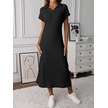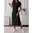 Kadın Kısa Kollu Yakalı Yandan Yırtmaçlı Kalın Fitilli Kaşkorse Elbise Siyah