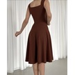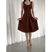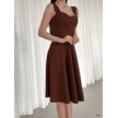 Kadın Krep Kumaş Askılı Kalp Yaka Düğme Detay Midi Boy Elbise Kahve