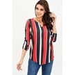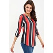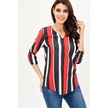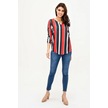 Kadın Lacivert & Kırmızı Yakası Yırtmaçlı Çizgili Krep Bluz Truvakar Kol Kaliteli Dokulu Kumaş Lacivert - Kırmızı