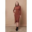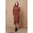 Kadın Likralı Triko Kumaş Tam Balıkçı Asimetrik Uzun Kol Diz Boy Elbise-fındık Kabuğu Fındık Kabuğu