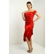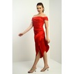 Kadın Madonna Yaka Drapeli Asimetrik Saten Kısa Elbise Kırmızı