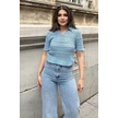 Kadın Mavi Ajurlu Merserize Triko Örme, Terletmez, Salaş Kalıp, Polo Yaka Bluz Mavi