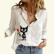 Kadın Moda Pamuk Keten Gömlek Kedi Baskılı Uzun Kollu Üst Bayan Günlük Düğmeli Bluz Beyaz