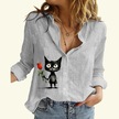 Kadın Moda Pamuk Keten Gömlek Kedi Baskılı Uzun Kollu Üst Bayan Günlük Düğmeli Bluz Gri