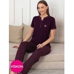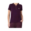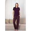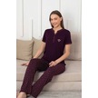 Kadın Mürdüm Desenli V Yaka 3 Düğmeli Likralı Viskon Kısa Kol Pijama Takımı Mürdüm