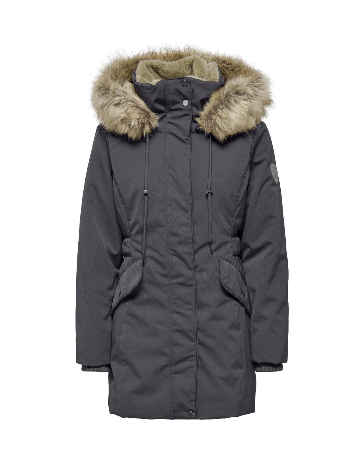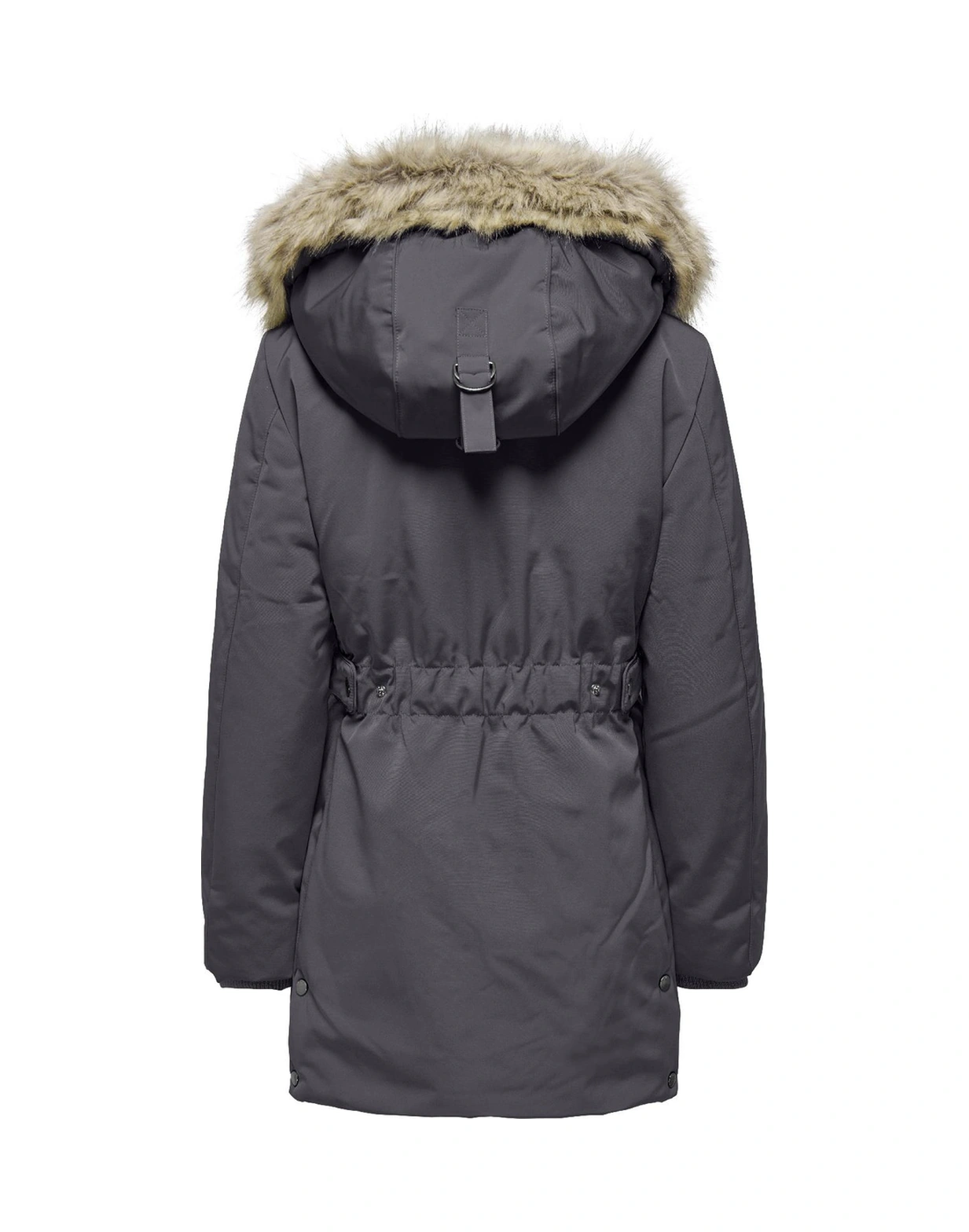 Kadın Only Onlnewprıska Parka Kapüşonlu, Suni Kürklü, Uzun Kollu, Siyah Kışlık Mont Gri