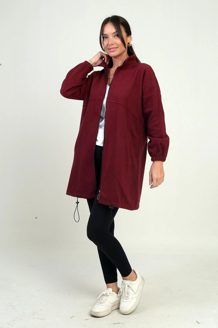 Kadın Önü Fermuarlı Altı Lastikli Cepli Uzun Kaşe Mont-41910 Bordo