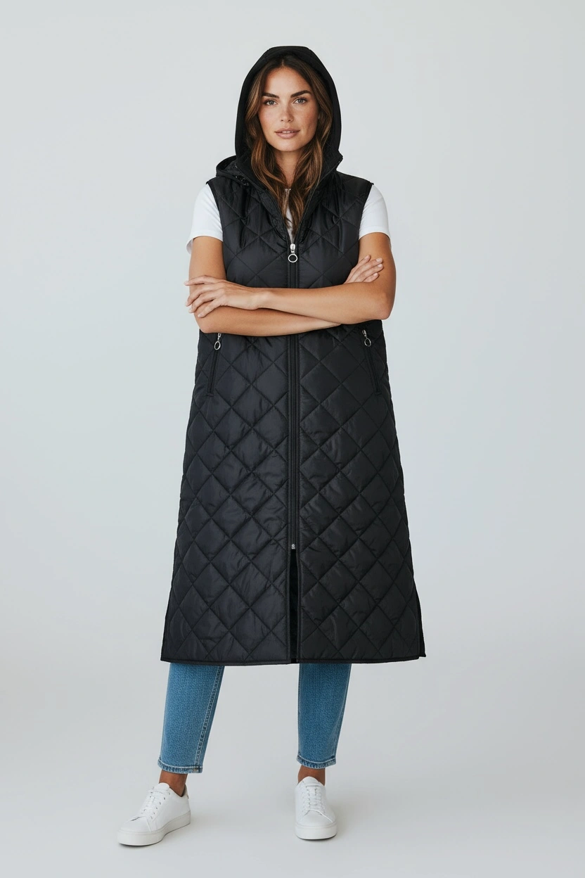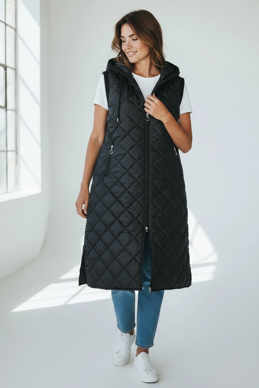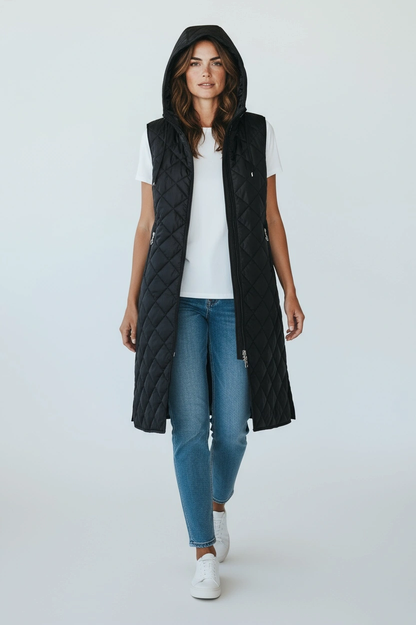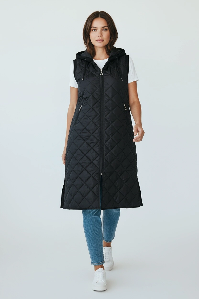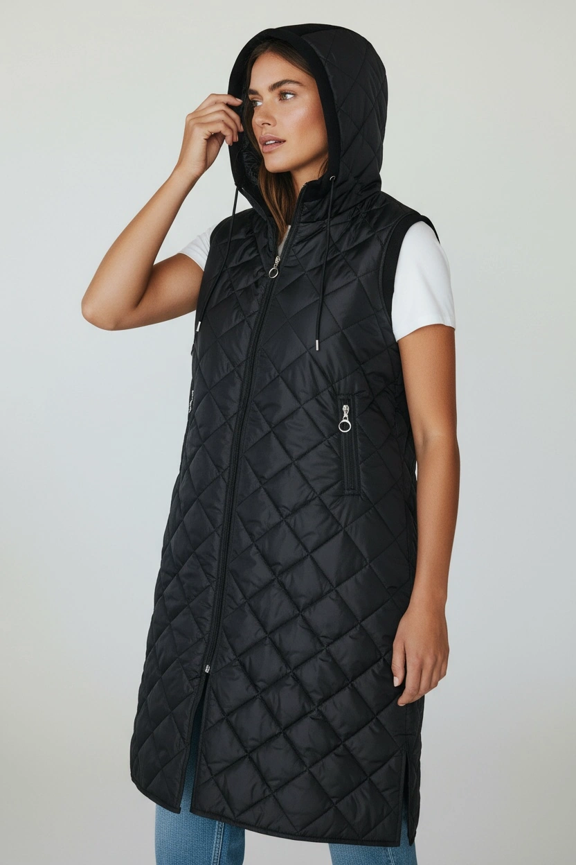 Kadın Önü Fermuarlı Yanlardan Cepli Kapüşonlu Kapitone Yelek Beyaz Siyah
