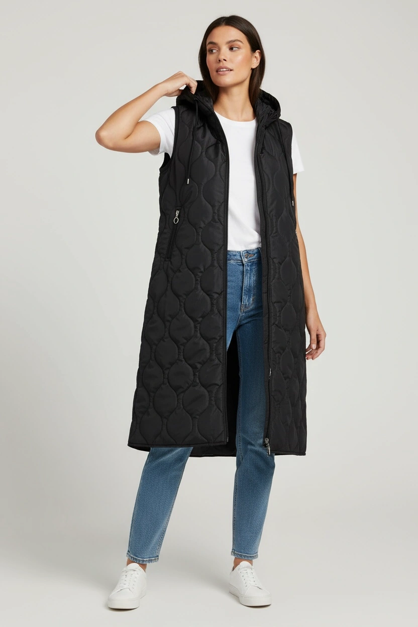 Kadın Önü Fermuarlı Yanlardan Cepli Kapüşonlu Kapitone Yelek Siyah