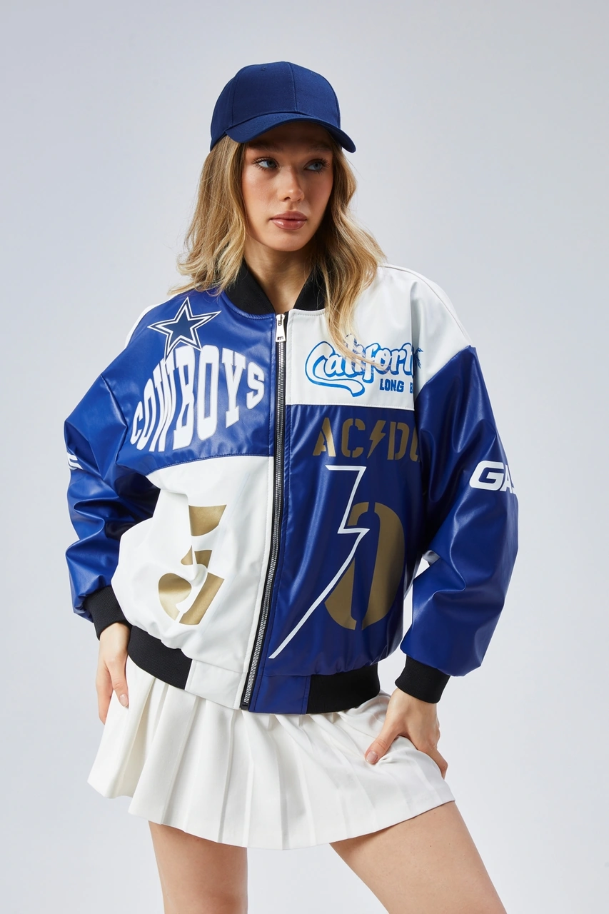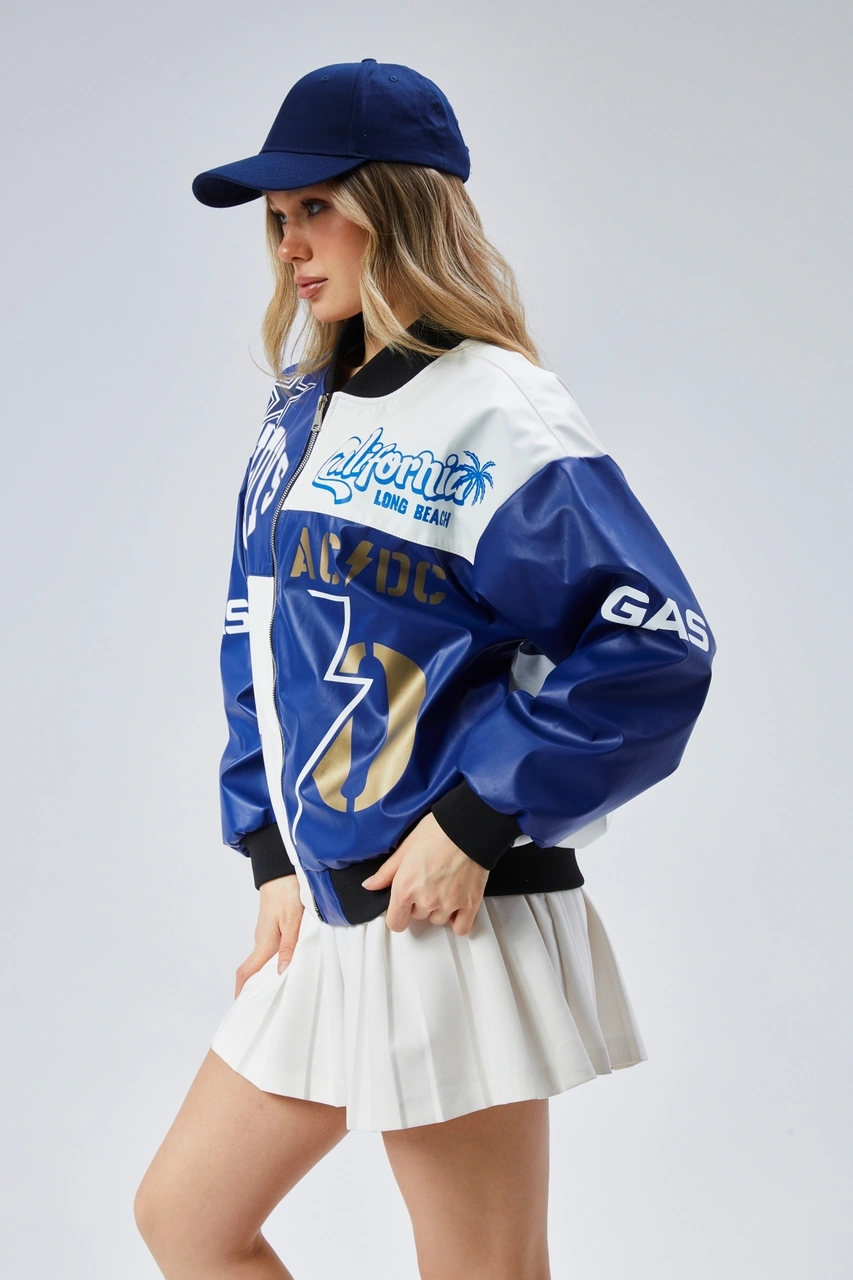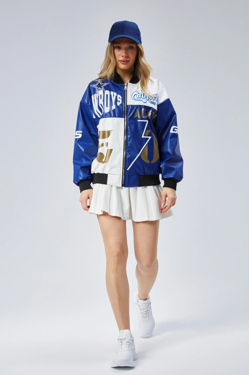 Kadın Oversize Baskılı Deri Motorcu Montu Fermuarlı Yarışçı Ceket Astarlı Bomber Kolej Mont Mavi