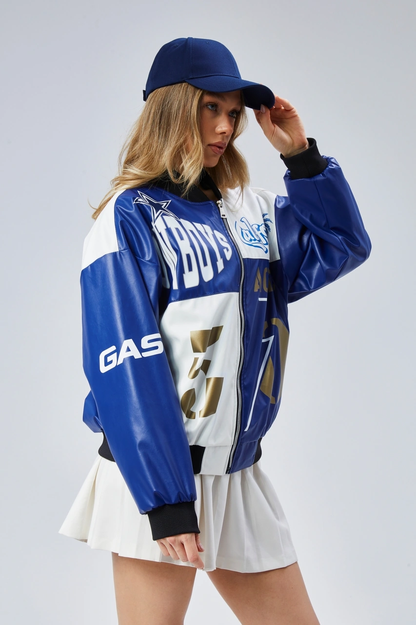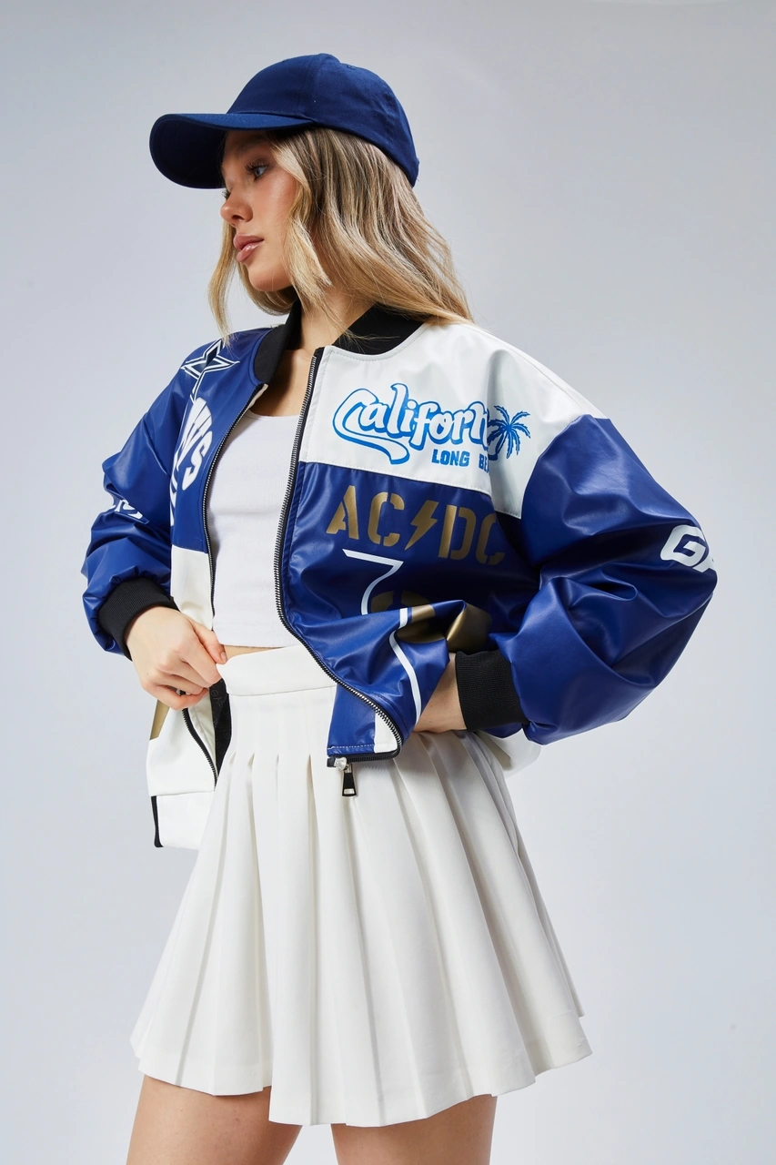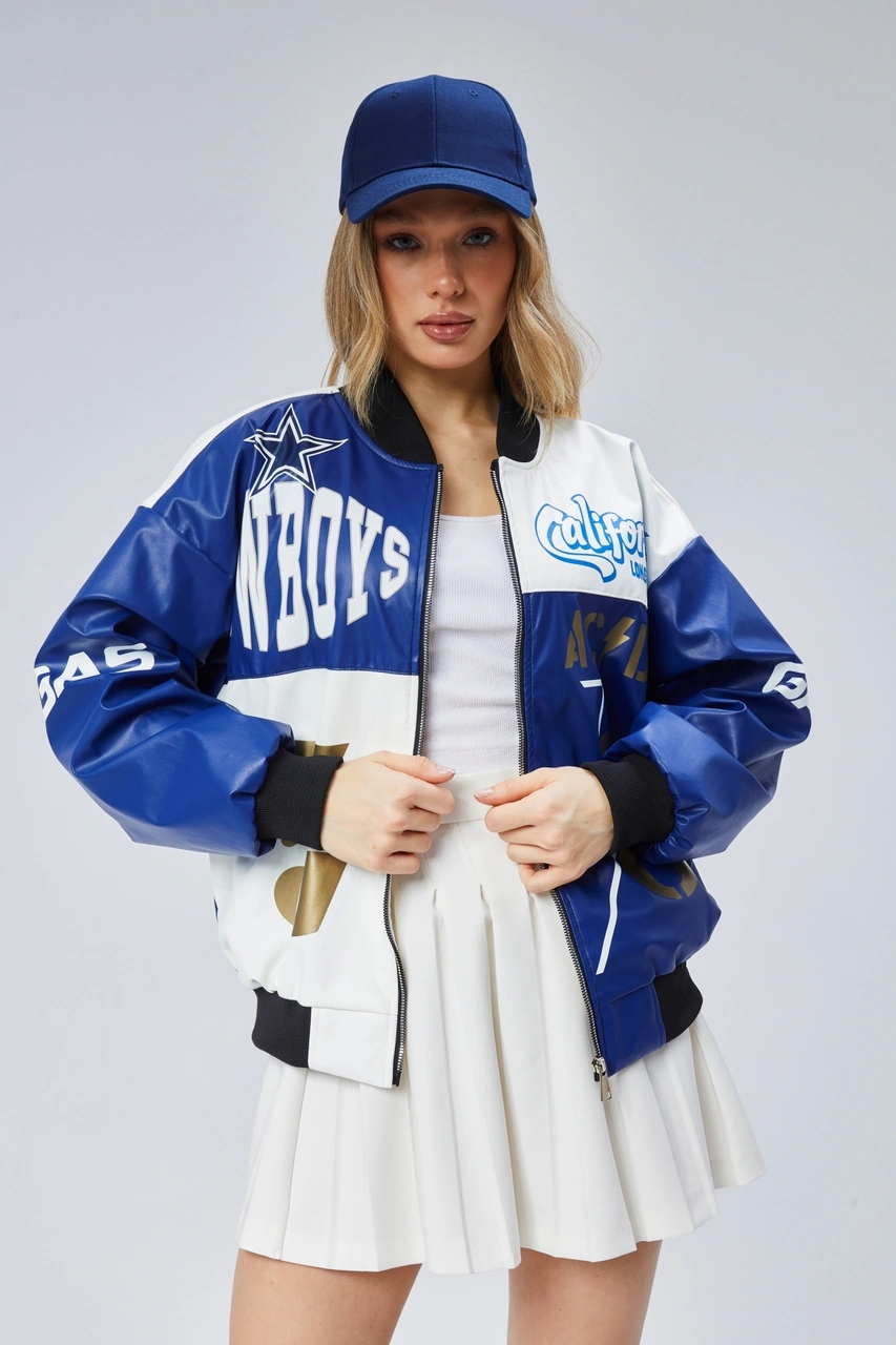 Kadın Oversize Baskılı Deri Motorcu Montu Fermuarlı Yarışçı Ceket Astarlı Bomber Kolej Mont Mavi