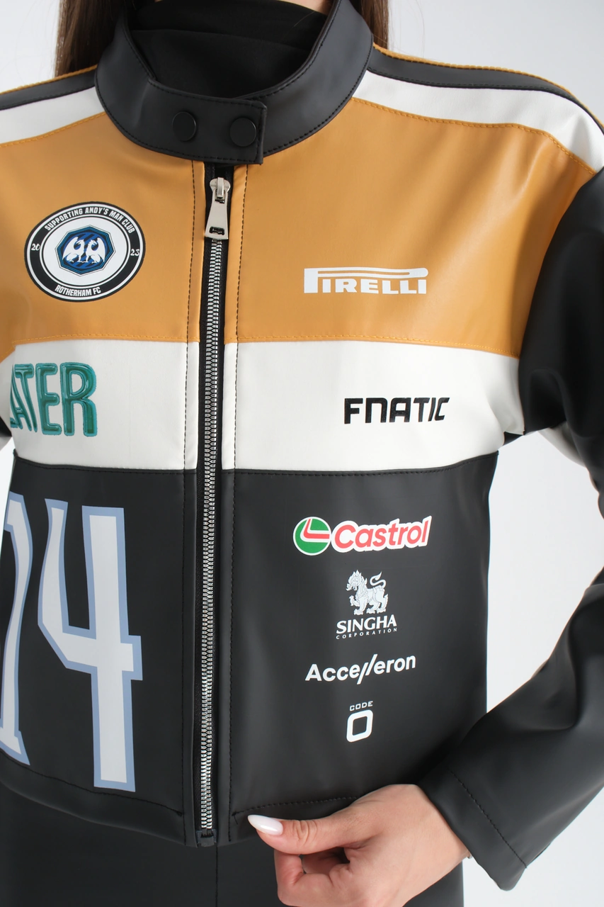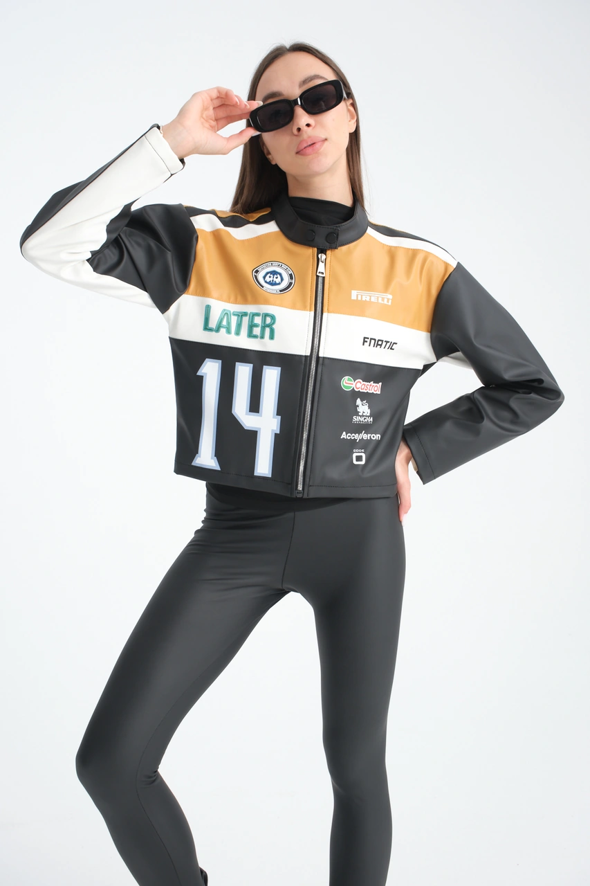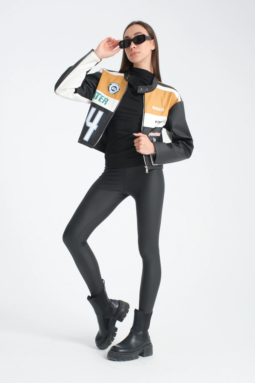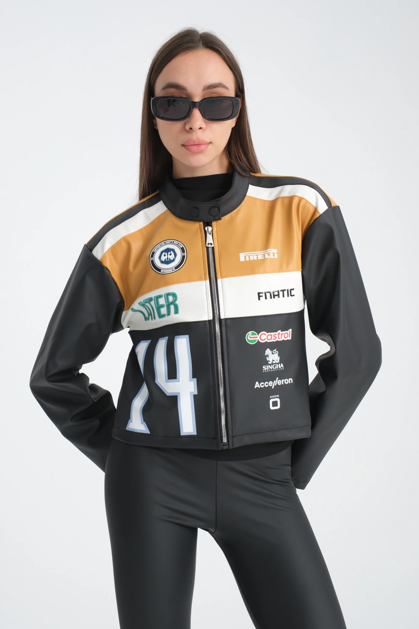 Kadın Oversize Baskılı Deri Şeritli Motorcu Montu Garnili Fermuarlı Yarışçı Ceketi Bomber Kolej Mont Hardal