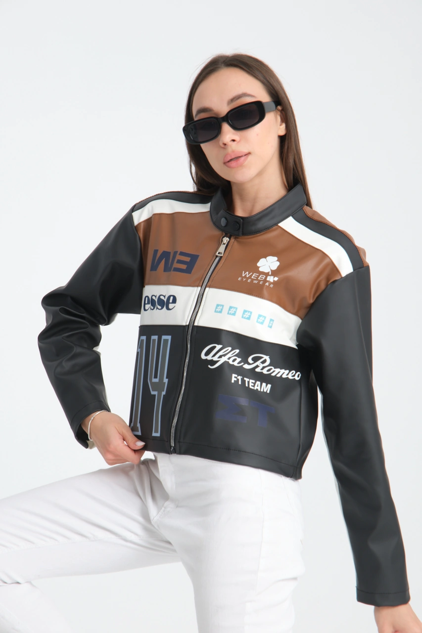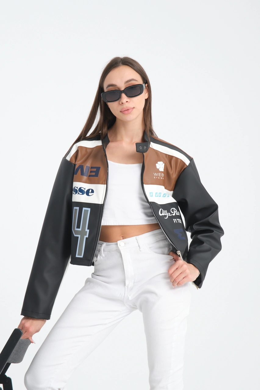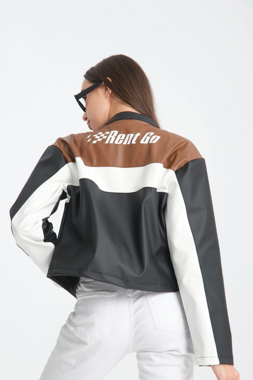 Kadın Oversize Baskılı Deri Şeritli Motorcu Montu Garnili Fermuarlı Yarışçı Ceketi Bomber Kolej Mont Kahve