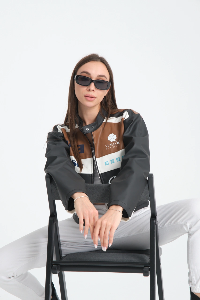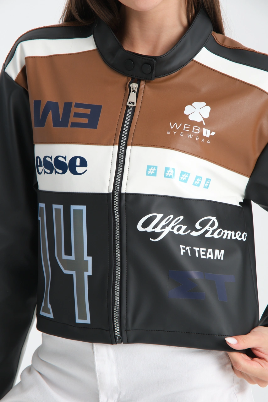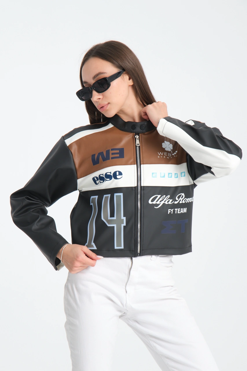Kadın Oversize Baskılı Deri Şeritli Motorcu Montu Garnili Fermuarlı Yarışçı Ceketi Bomber Kolej Mont Kahve