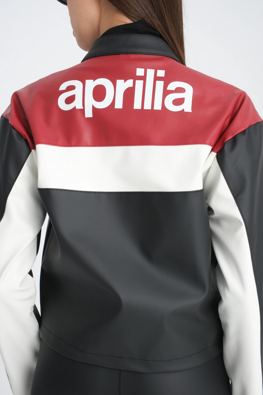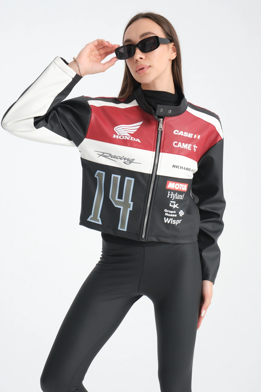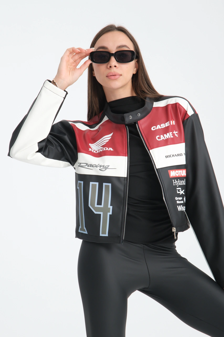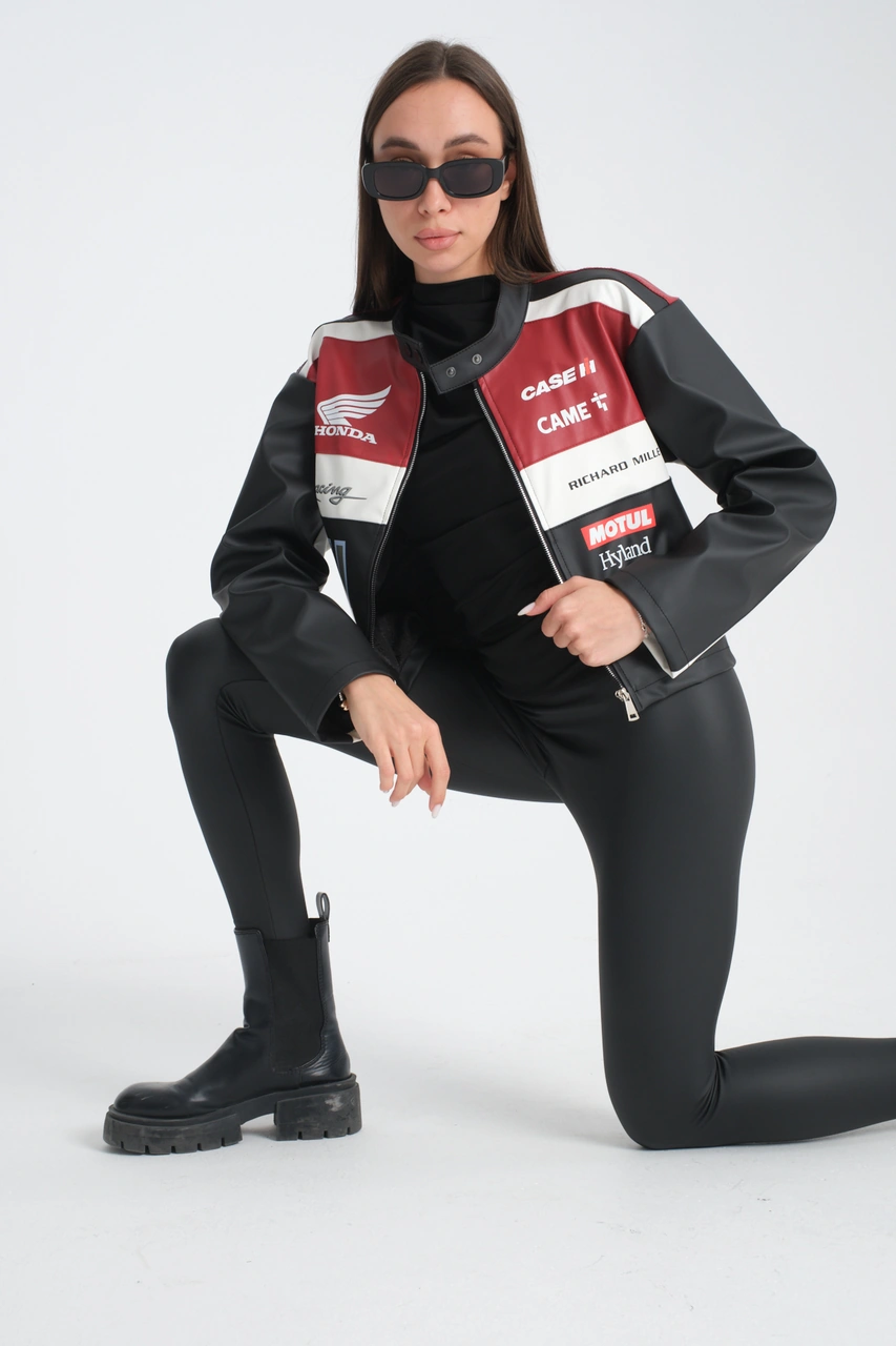 Kadın Oversize Baskılı Deri Şeritli Motorcu Montu Garnili Fermuarlı Yarışçı Ceketi Bomber Kolej Mont Kırmızı