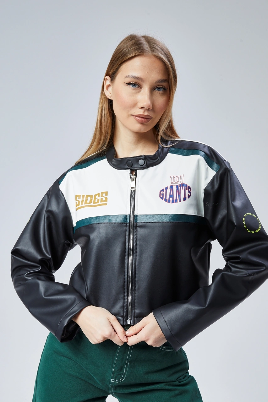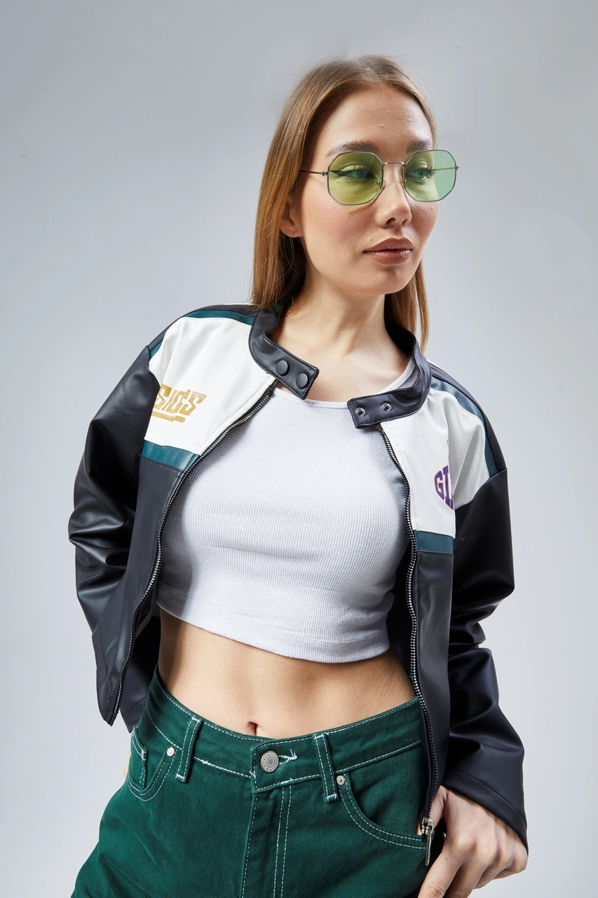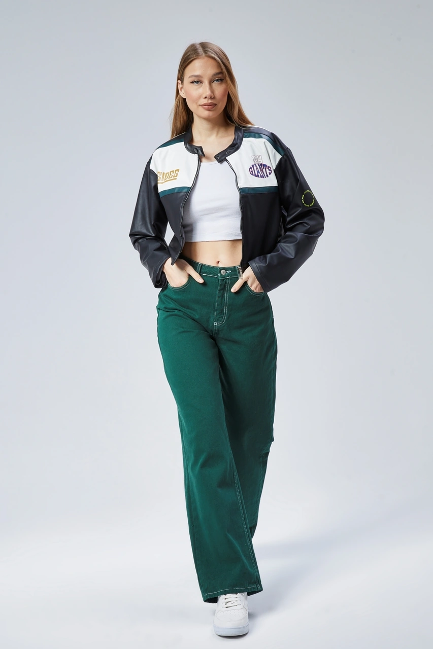 Kadın Oversize Baskılı Deri Şeritli Motorcu Montu Kısa Fermuarlı Yarışçı Ceketi Bomber Kolej Mont Yeşil