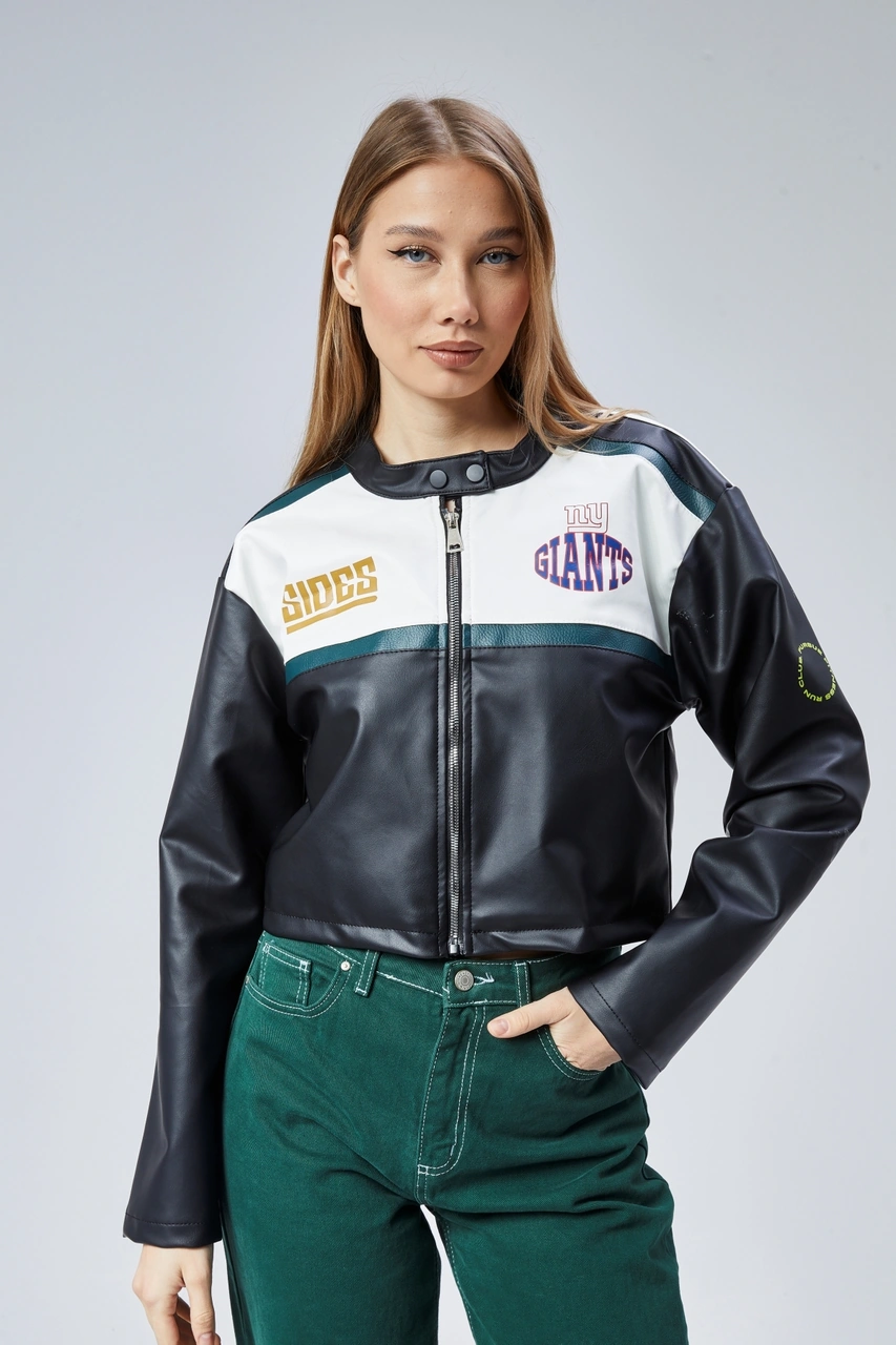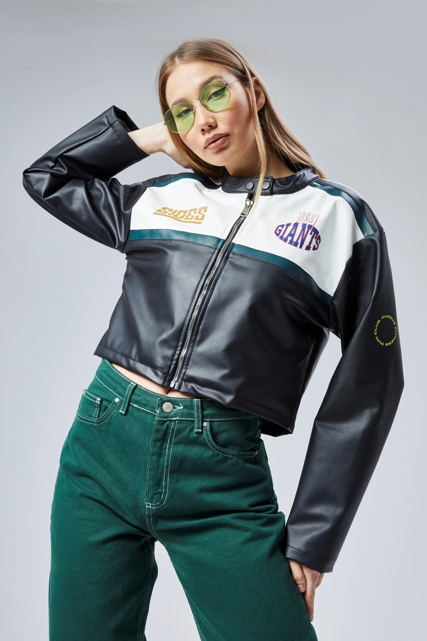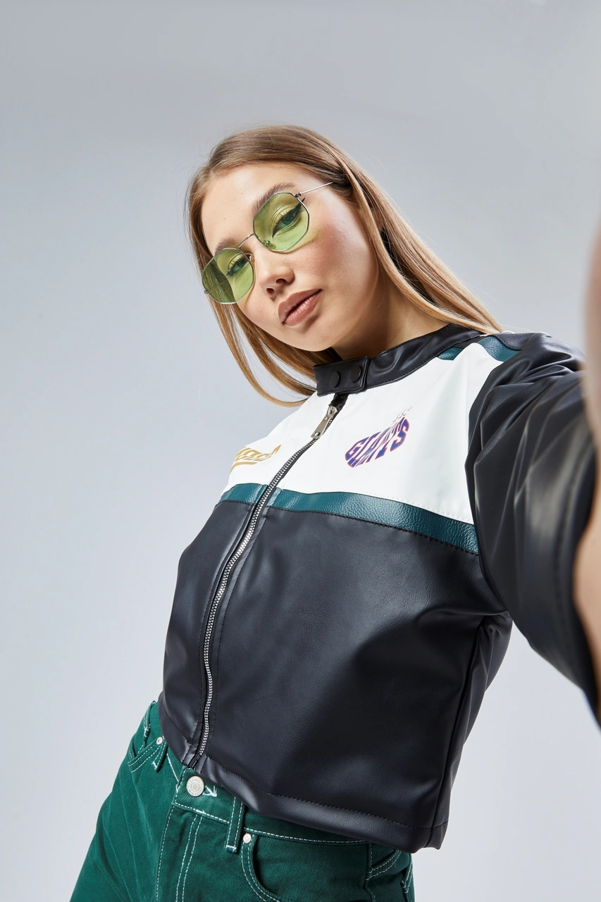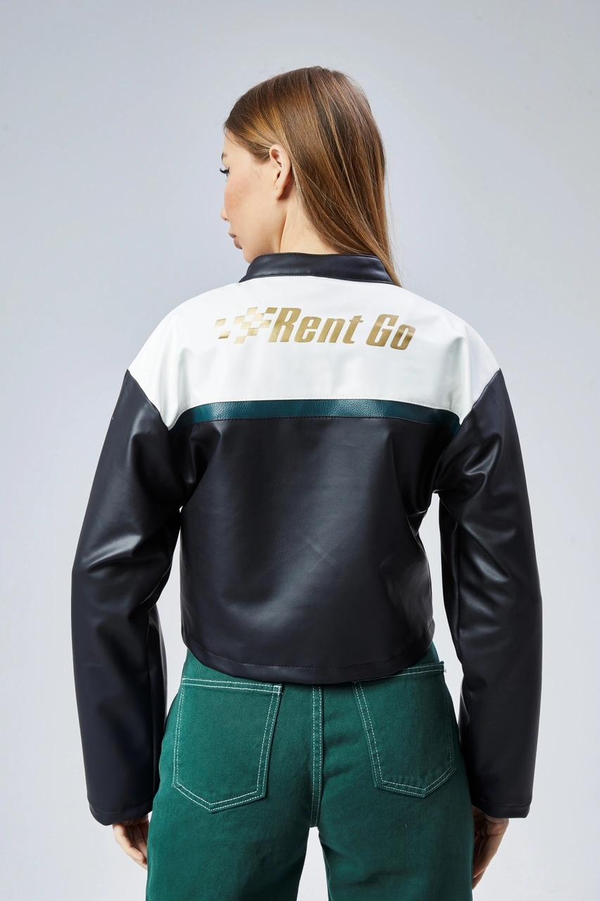 Kadın Oversize Baskılı Deri Şeritli Motorcu Montu Kısa Fermuarlı Yarışçı Ceketi Bomber Kolej Mont Yeşil