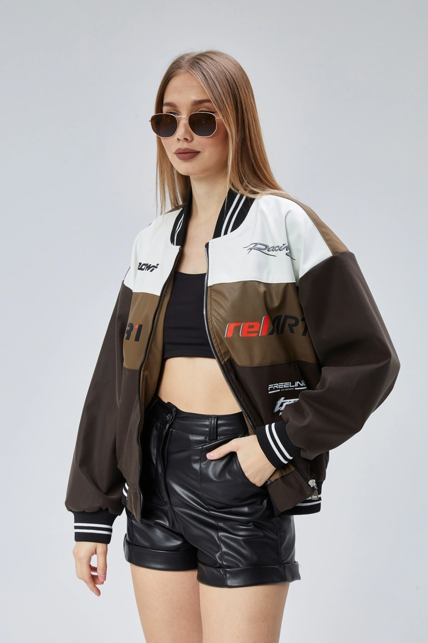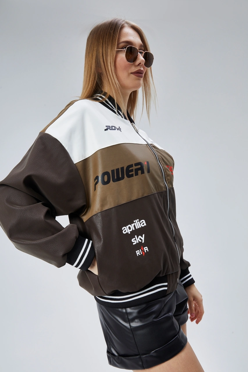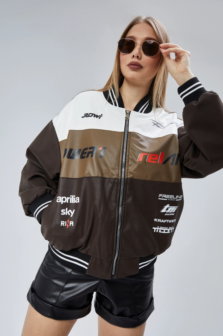 Kadın Oversize Baskılı Motorcu Yarışçı Montu Kolej Ceketi Kahverengi