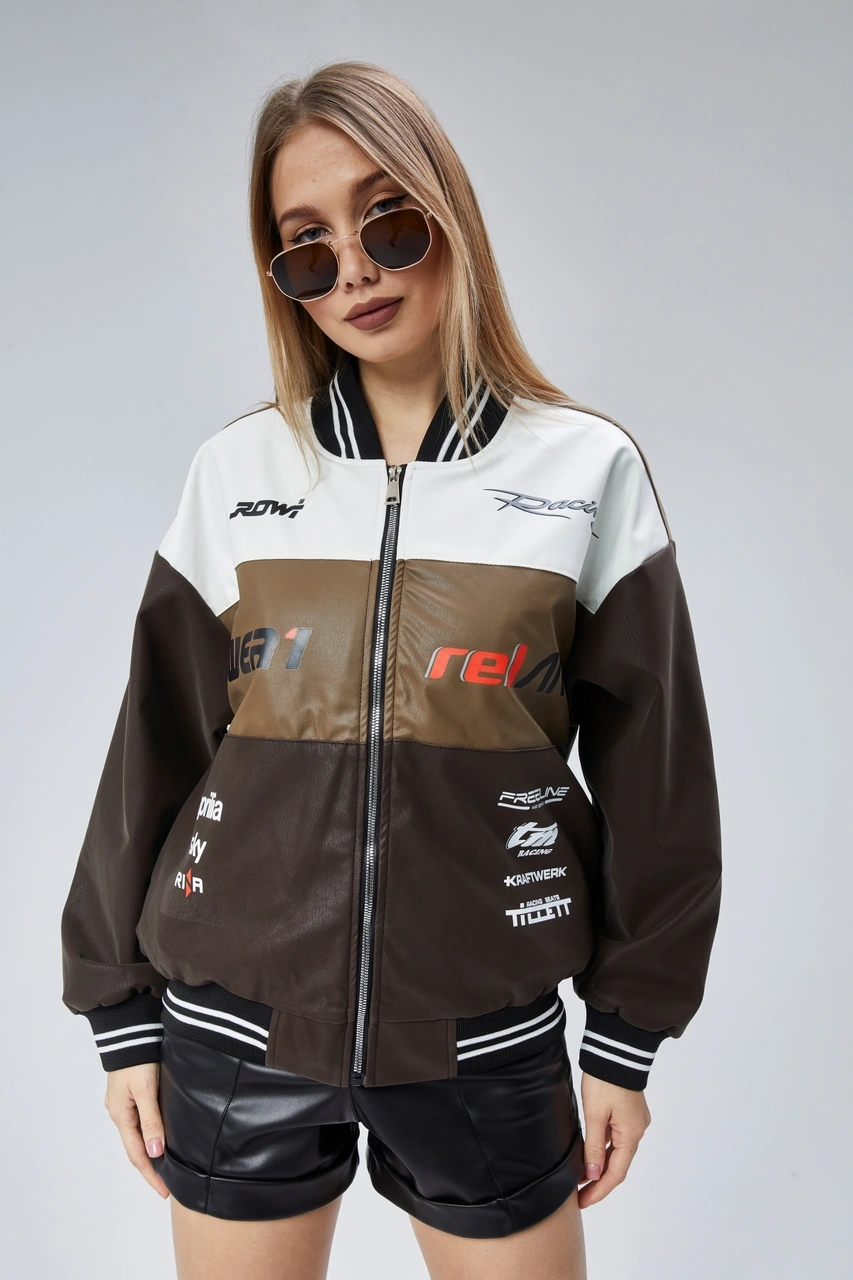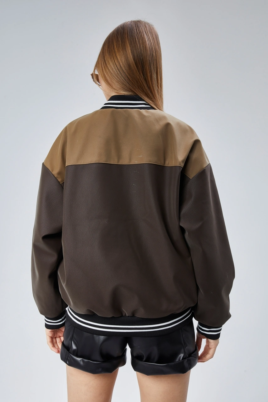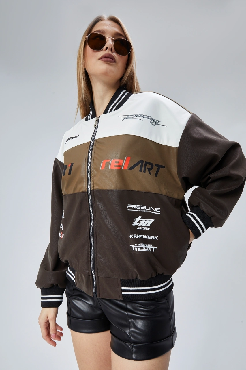 Kadın Oversize Baskılı Motorcu Yarışçı Montu Kolej Ceketi Kahverengi
