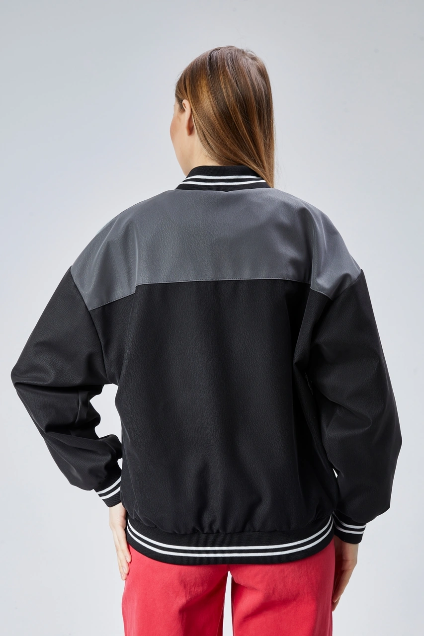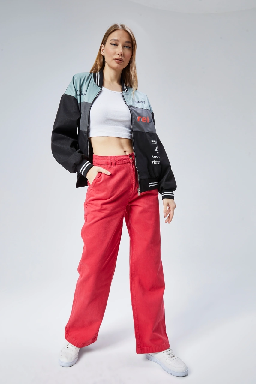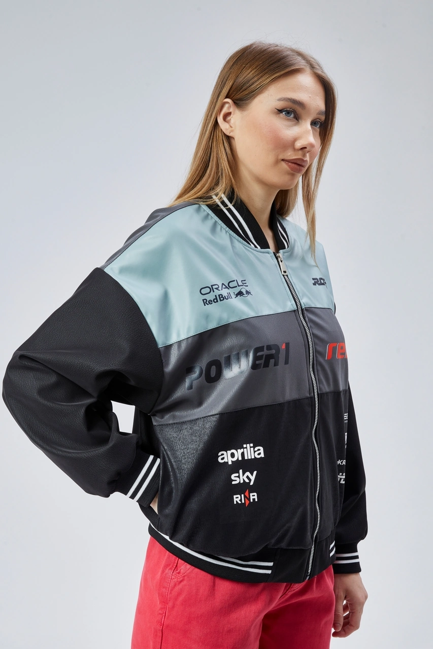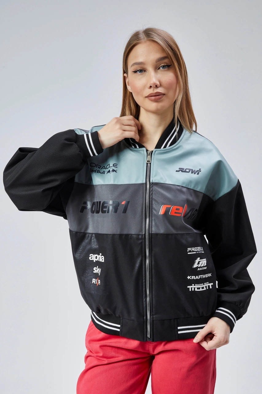 Kadın Oversize Baskılı Motorcu Yarışçı Montu Kolej Ceketi Mint Yeşili