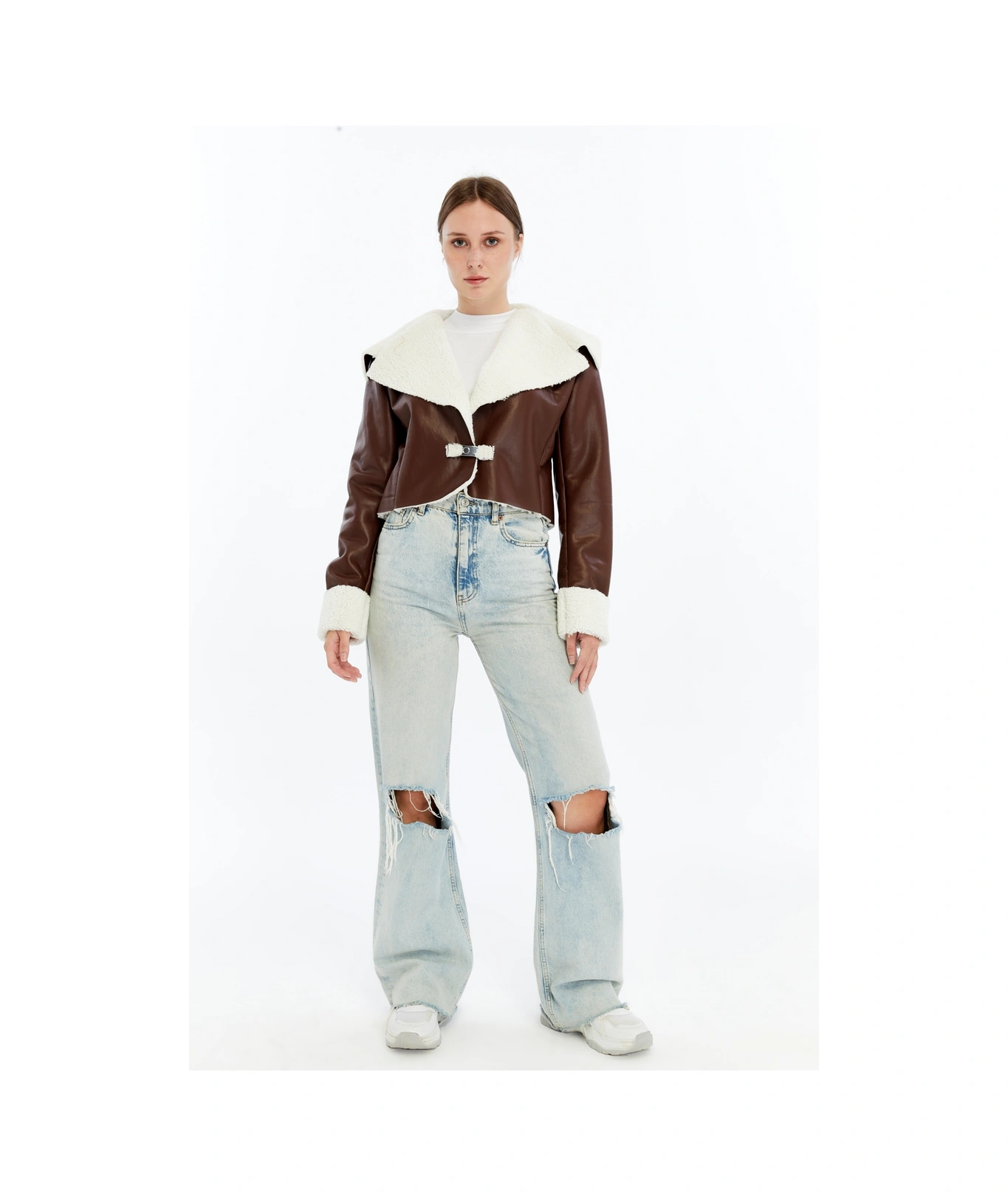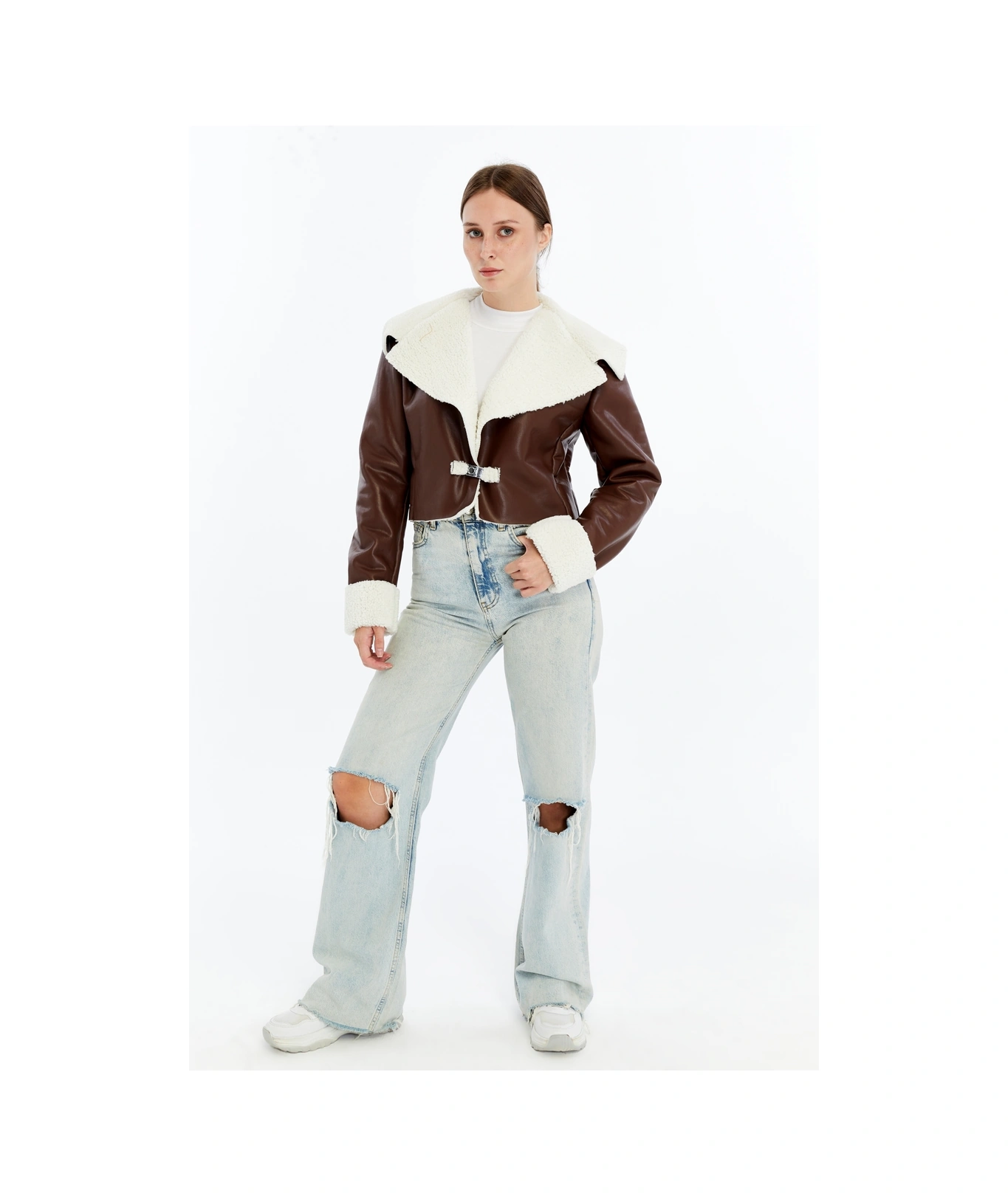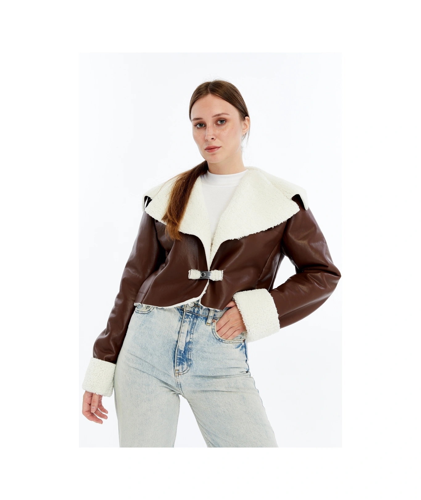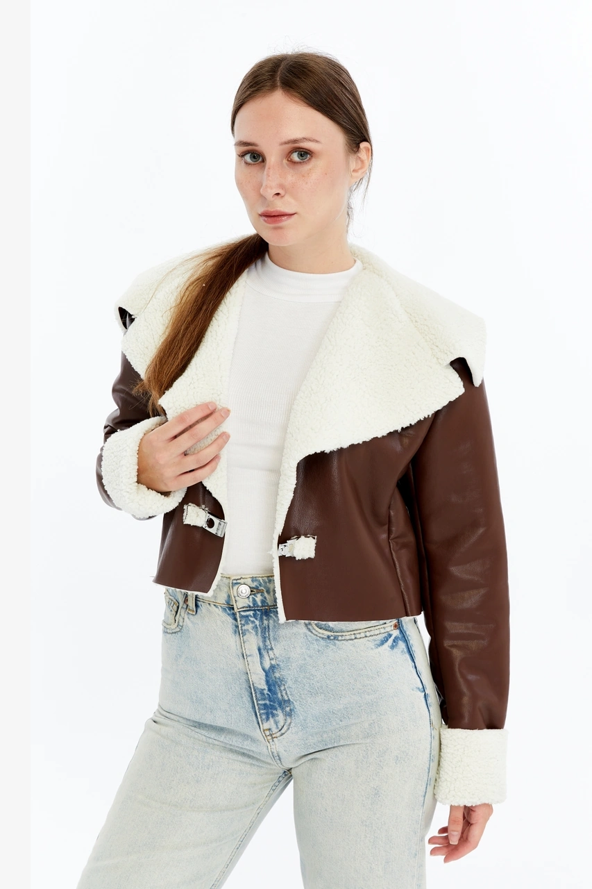 Kadın Oversize Deri Mont Kürklü Ceket Niş Kompakt Tasarım Günlük Spor Görünüm Kahverengi