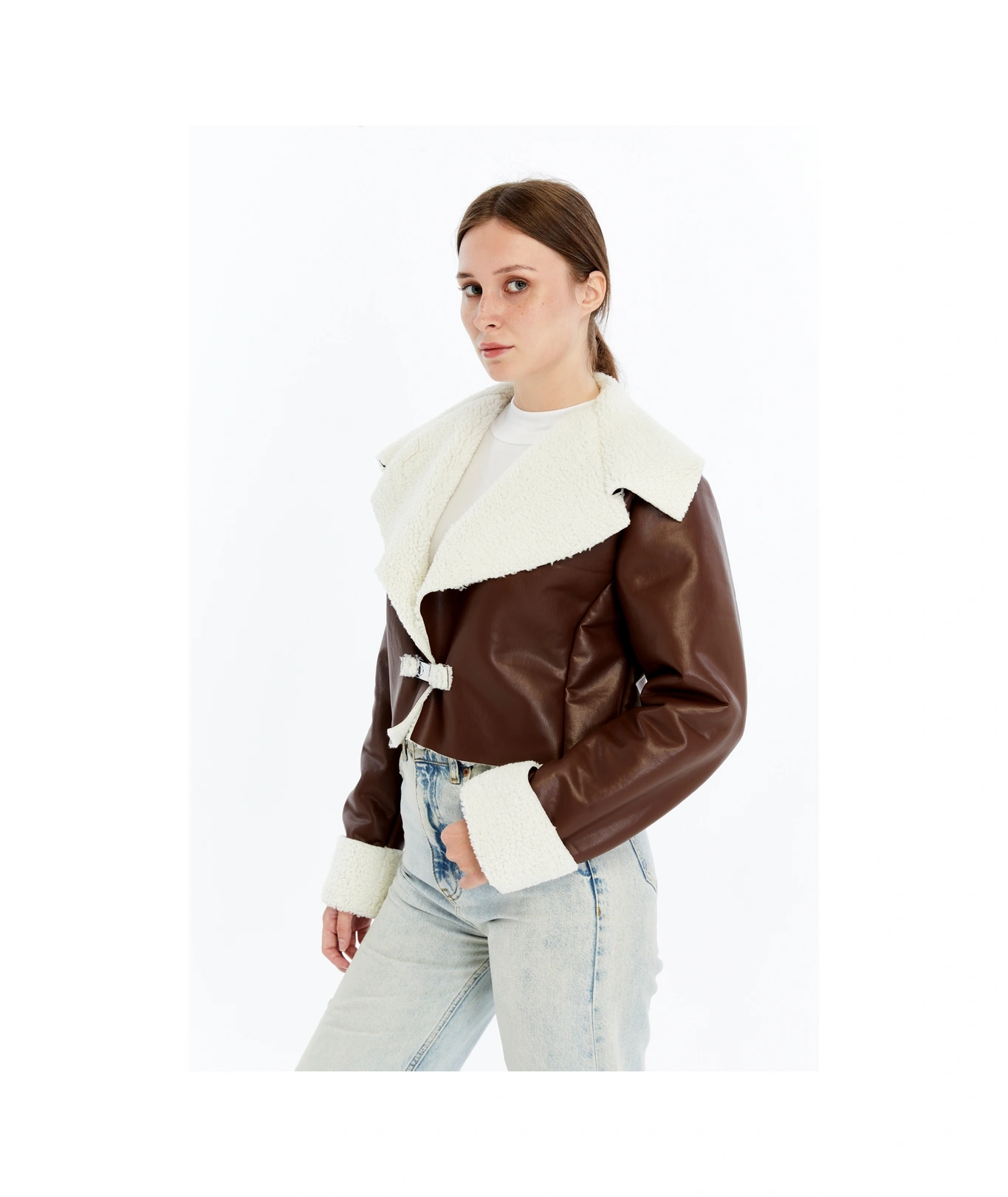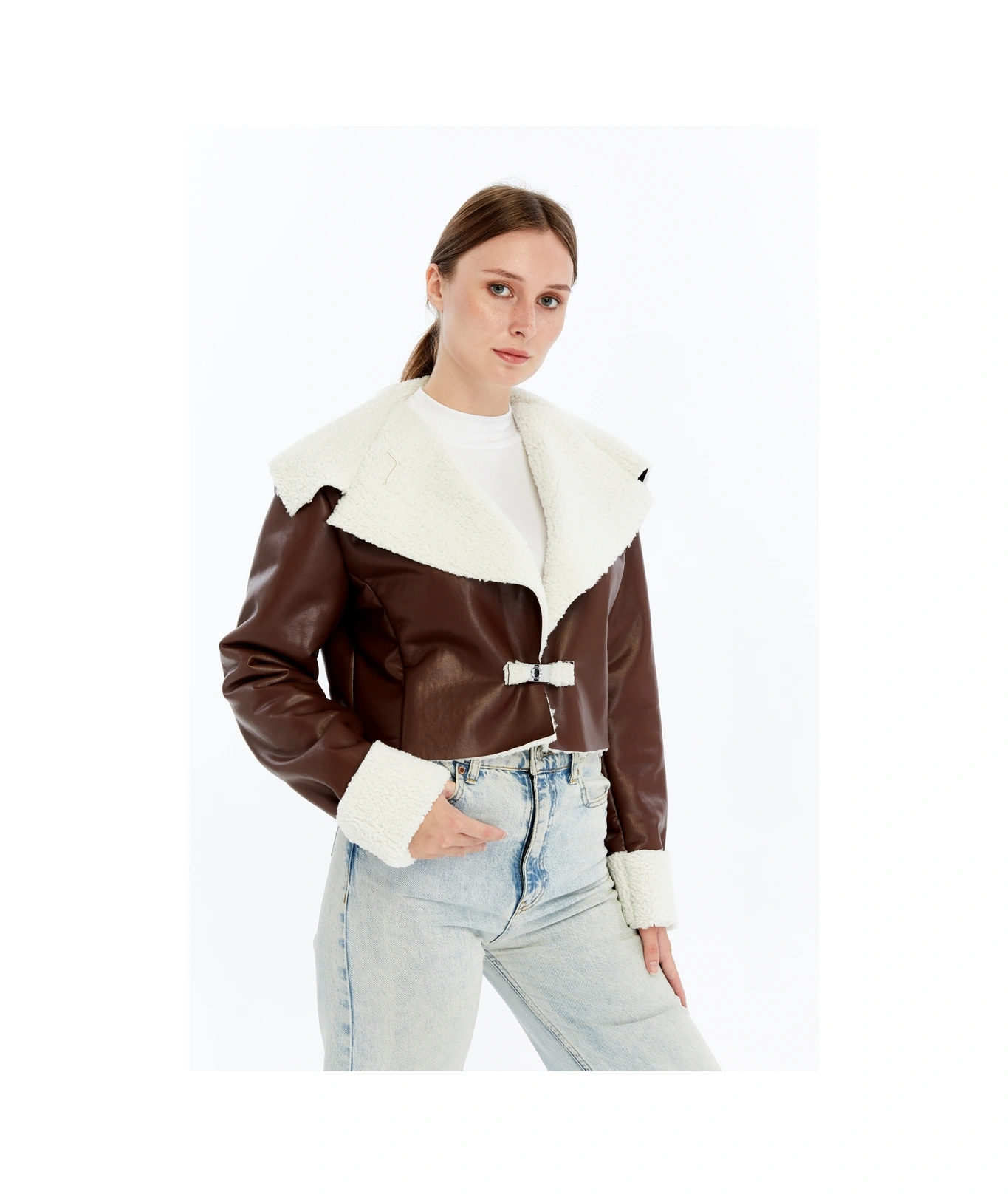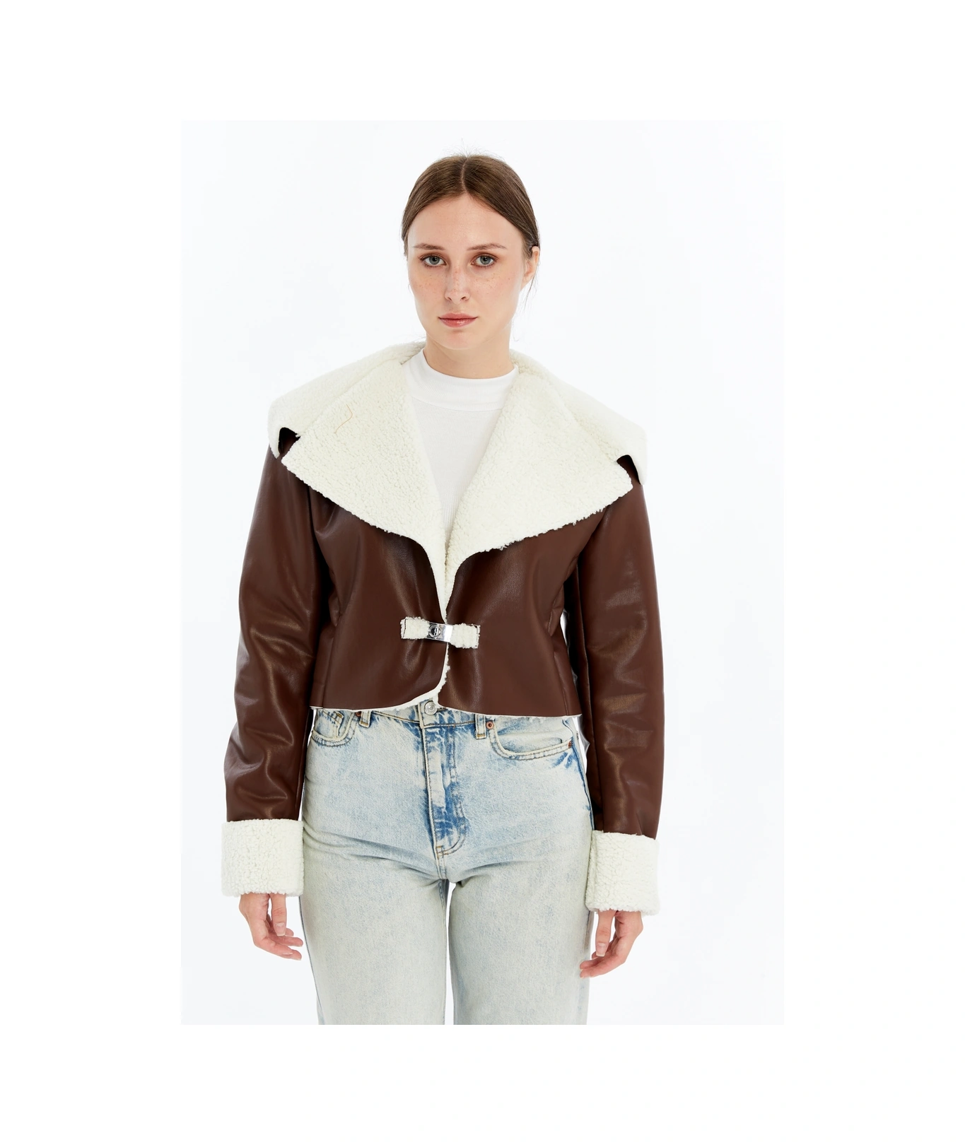 Kadın Oversize Deri Mont Kürklü Ceket Niş Kompakt Tasarım Günlük Spor Görünüm Kahverengi