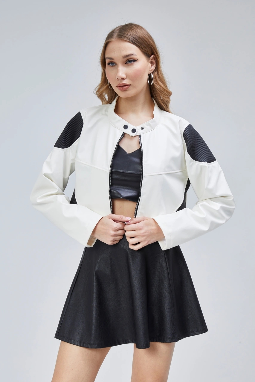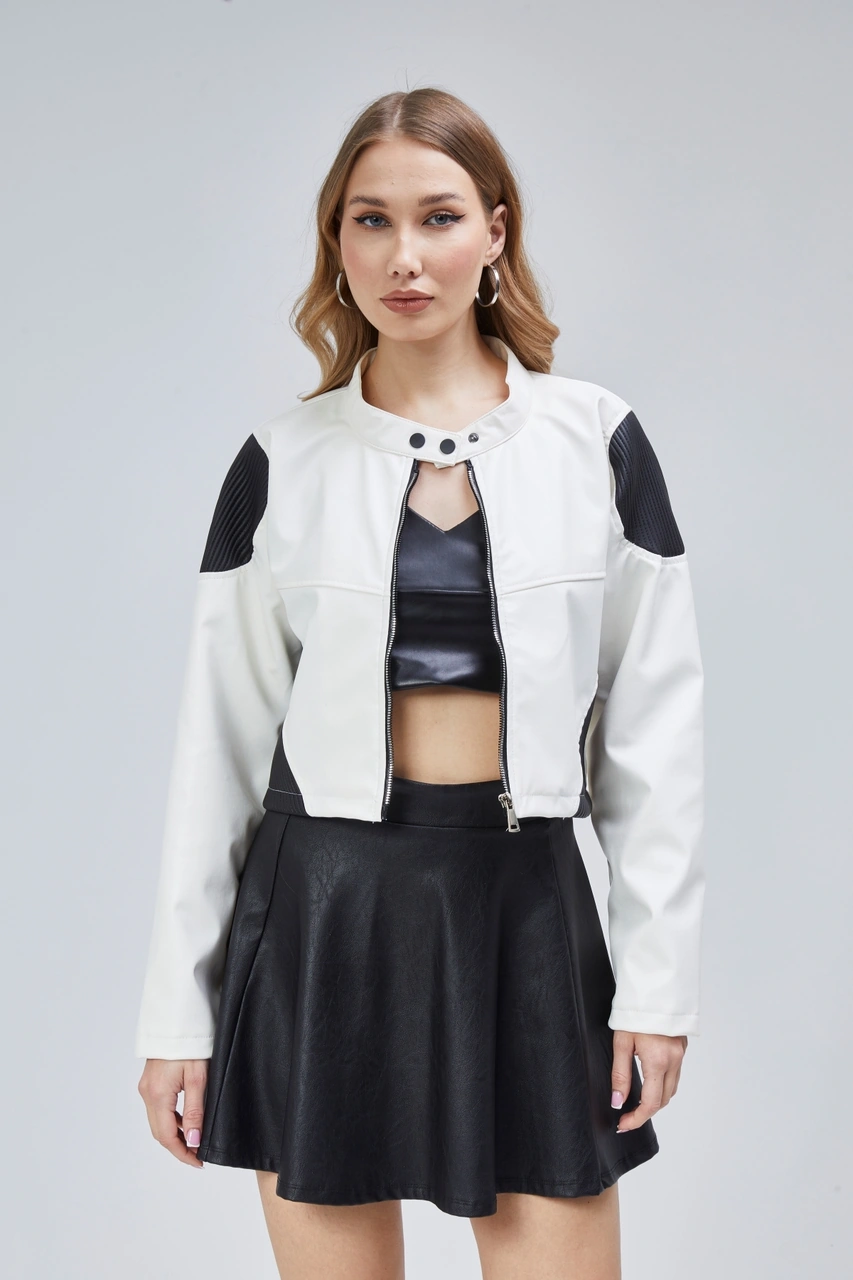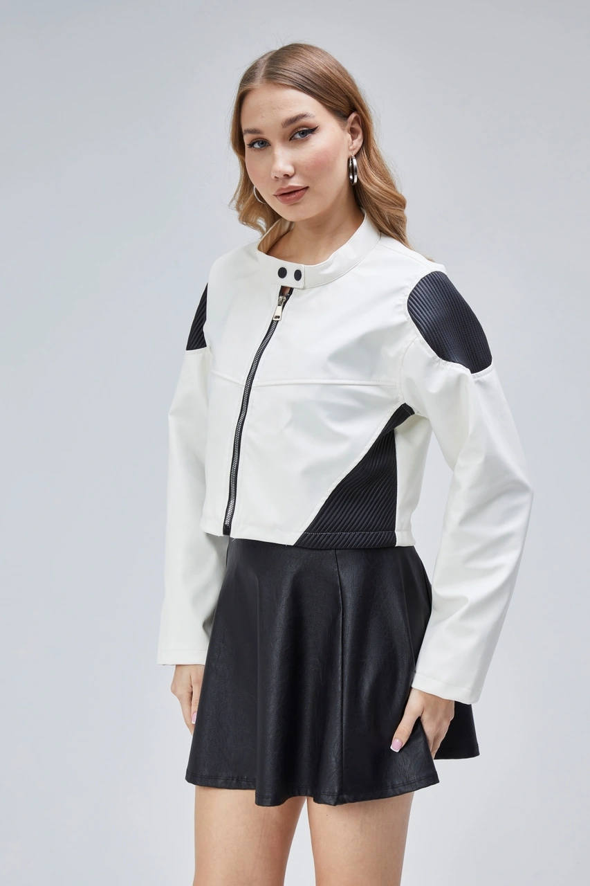 Kadın Oversize Fermuarlı Yaka Çıt Çıtlı Omuz Ve Etek Beyaz Desenli Kolej Yarışçı Ceket Motorcu Mont Beyaz-siyah