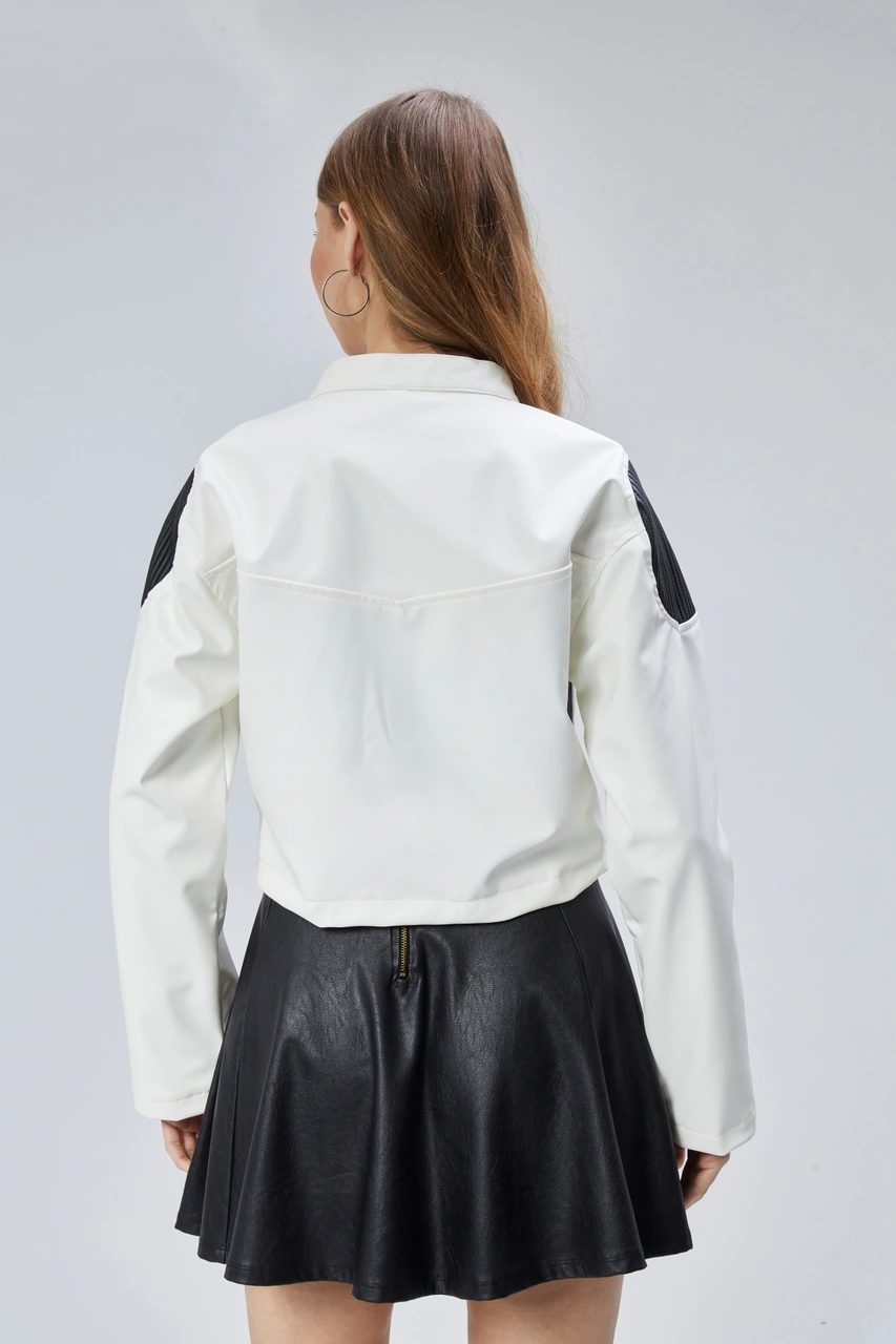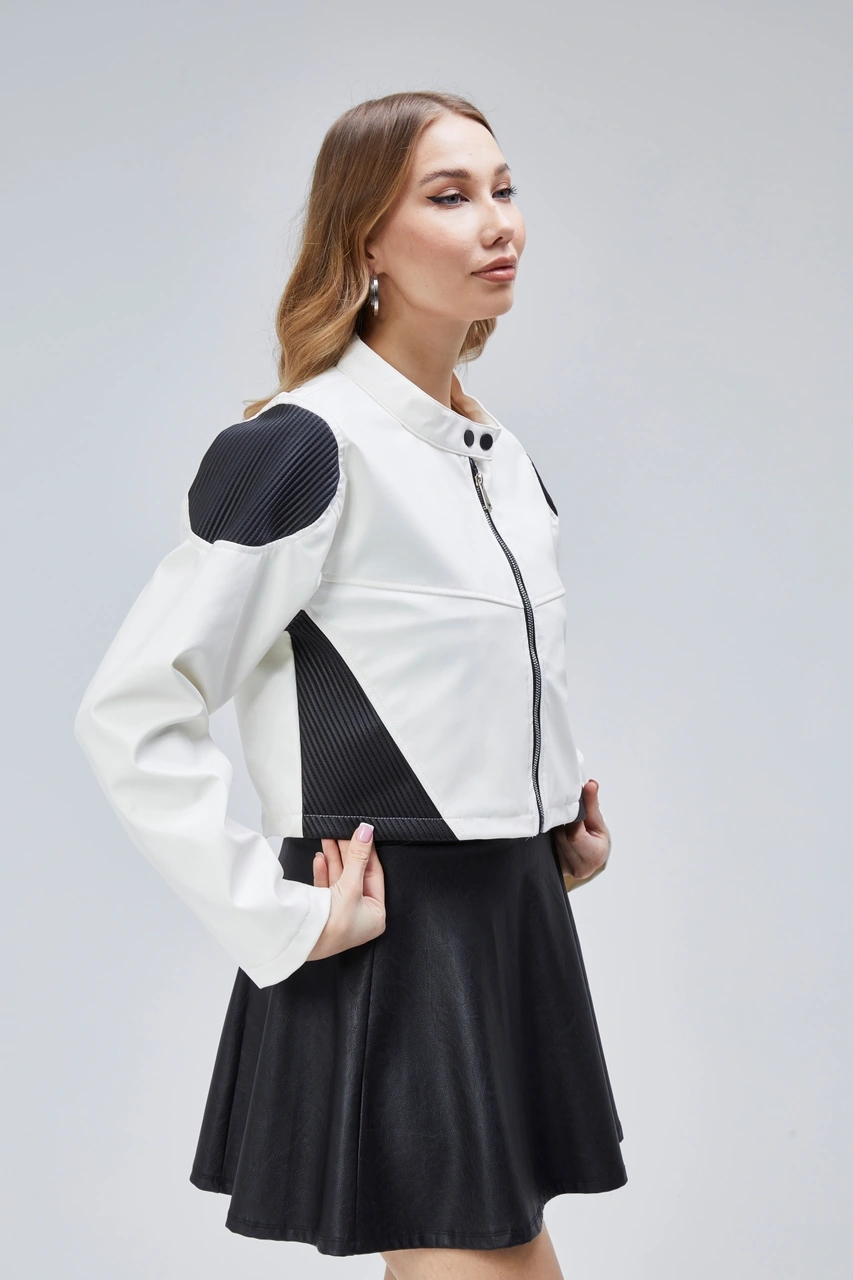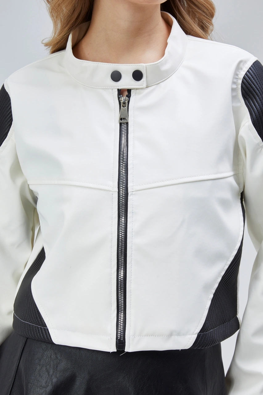 Kadın Oversize Fermuarlı Yaka Çıt Çıtlı Omuz Ve Etek Beyaz Desenli Kolej Yarışçı Ceket Motorcu Mont Beyaz-siyah