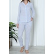 Kadın Pijama Uzun Kollu Düğmeli Pijama Takımı Cepli Pamuk Mavi