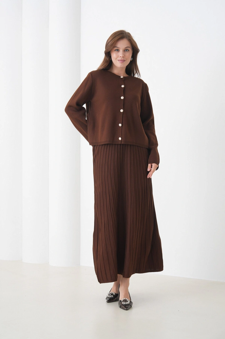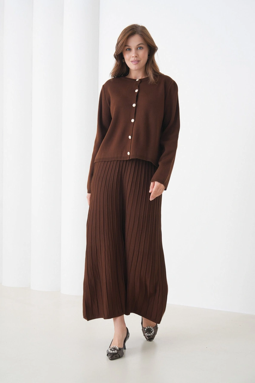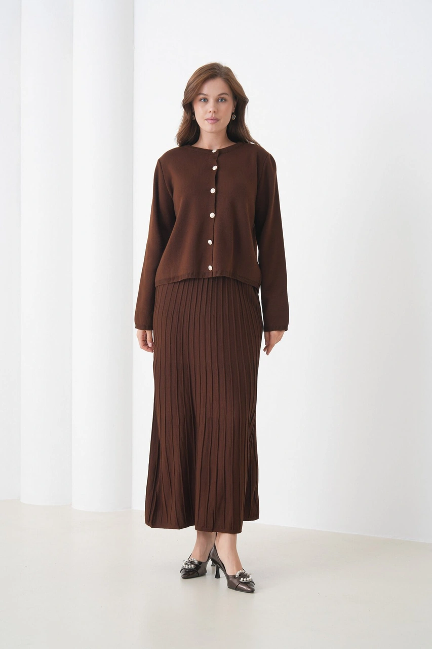 Kadın Pileli Etek Kazağı Düğmeli Tesettüre Uygun Örgü Triko Etekli Ceket Takım Kahverengi