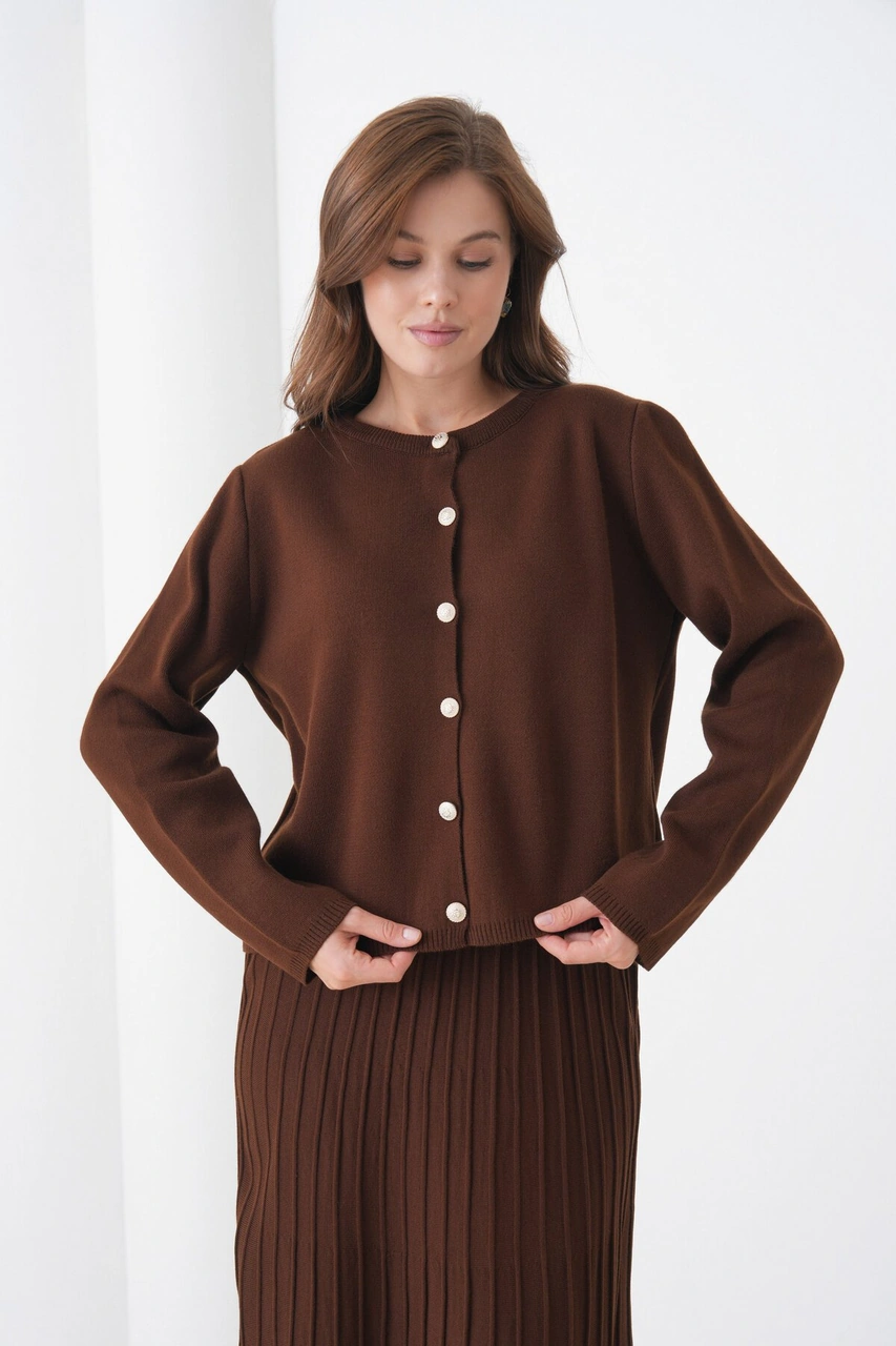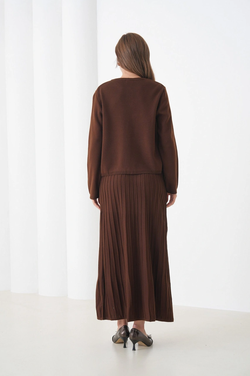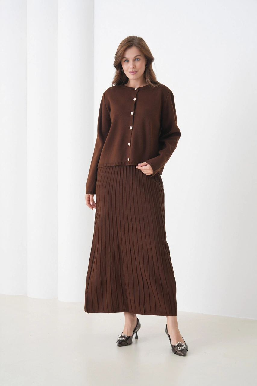 Kadın Pileli Etek Kazağı Düğmeli Tesettüre Uygun Örgü Triko Etekli Ceket Takım Kahverengi