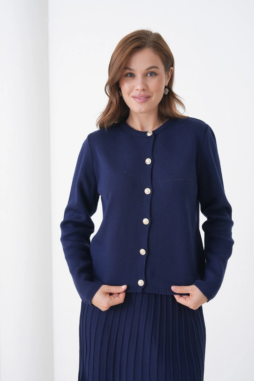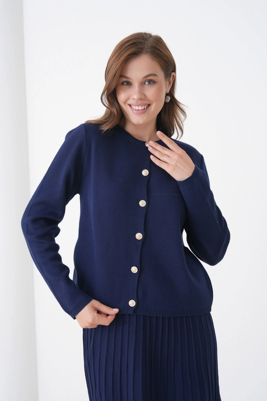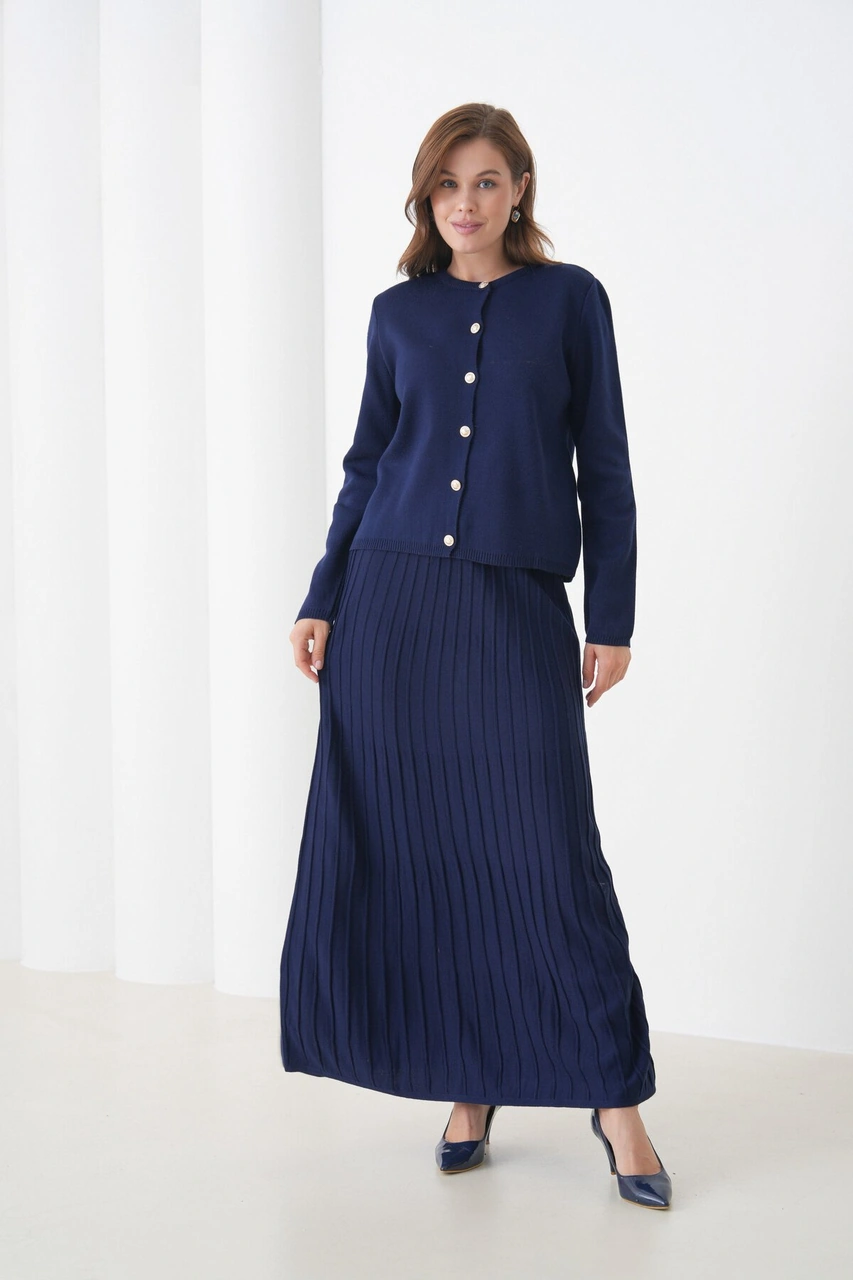 Kadın Pileli Etek Kazağı Düğmeli Tesettüre Uygun Örgü Triko Etekli Ceket Takım Lacivert
