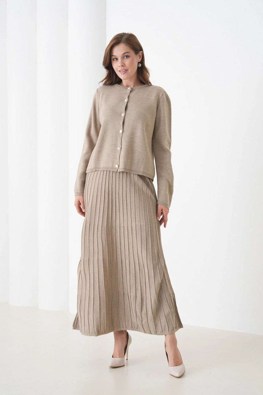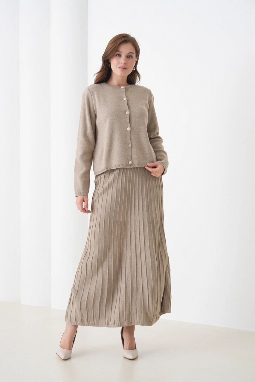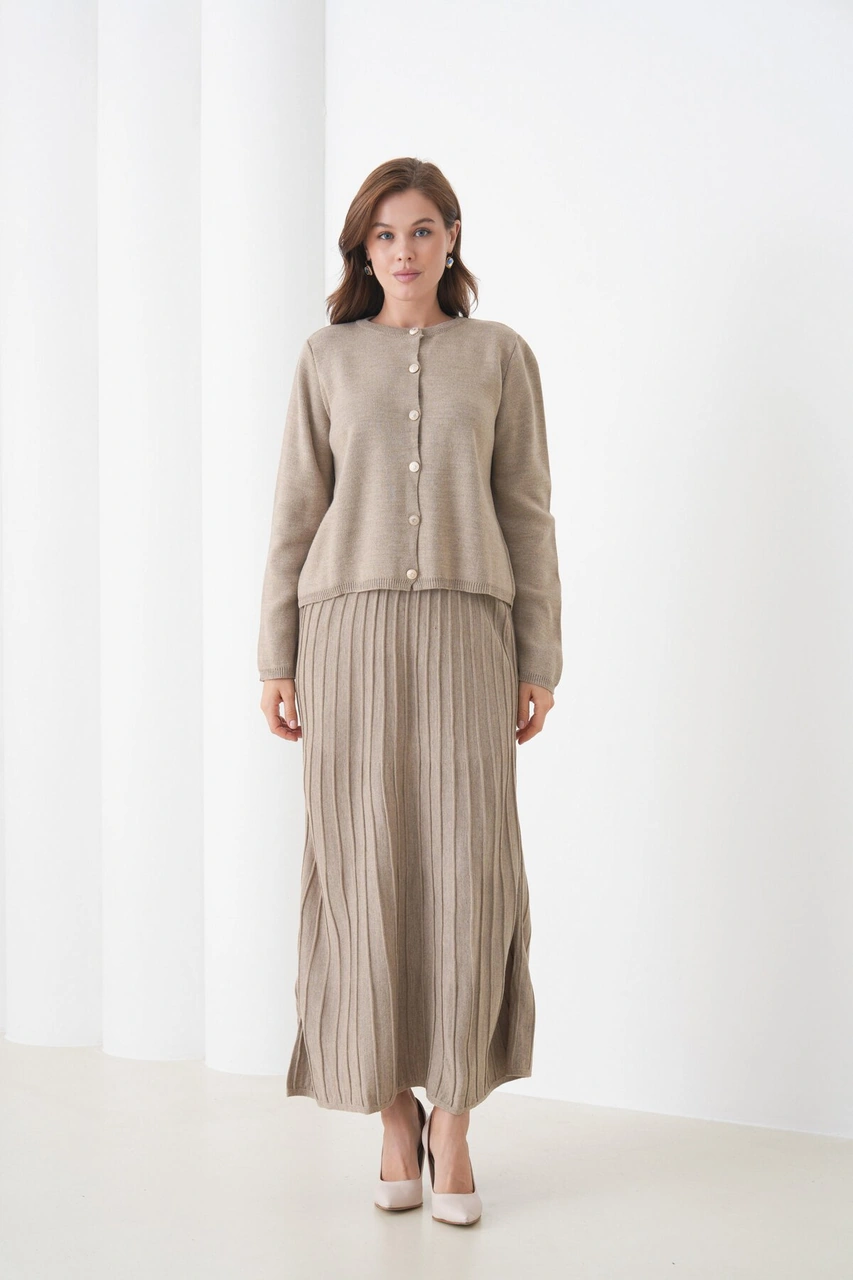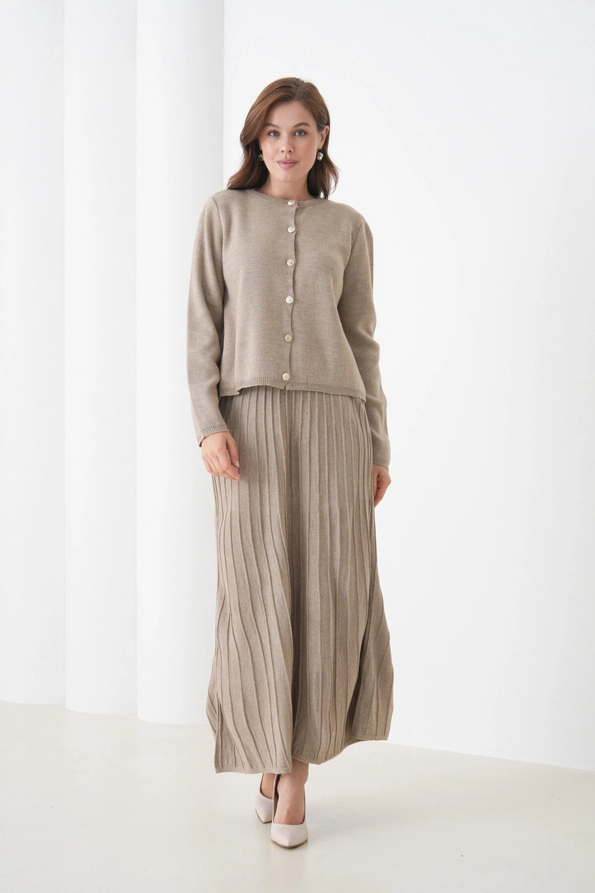 Kadın Pileli Etek Kazağı Düğmeli Tesettüre Uygun Örgü Triko Etekli Ceket Takım Vizon