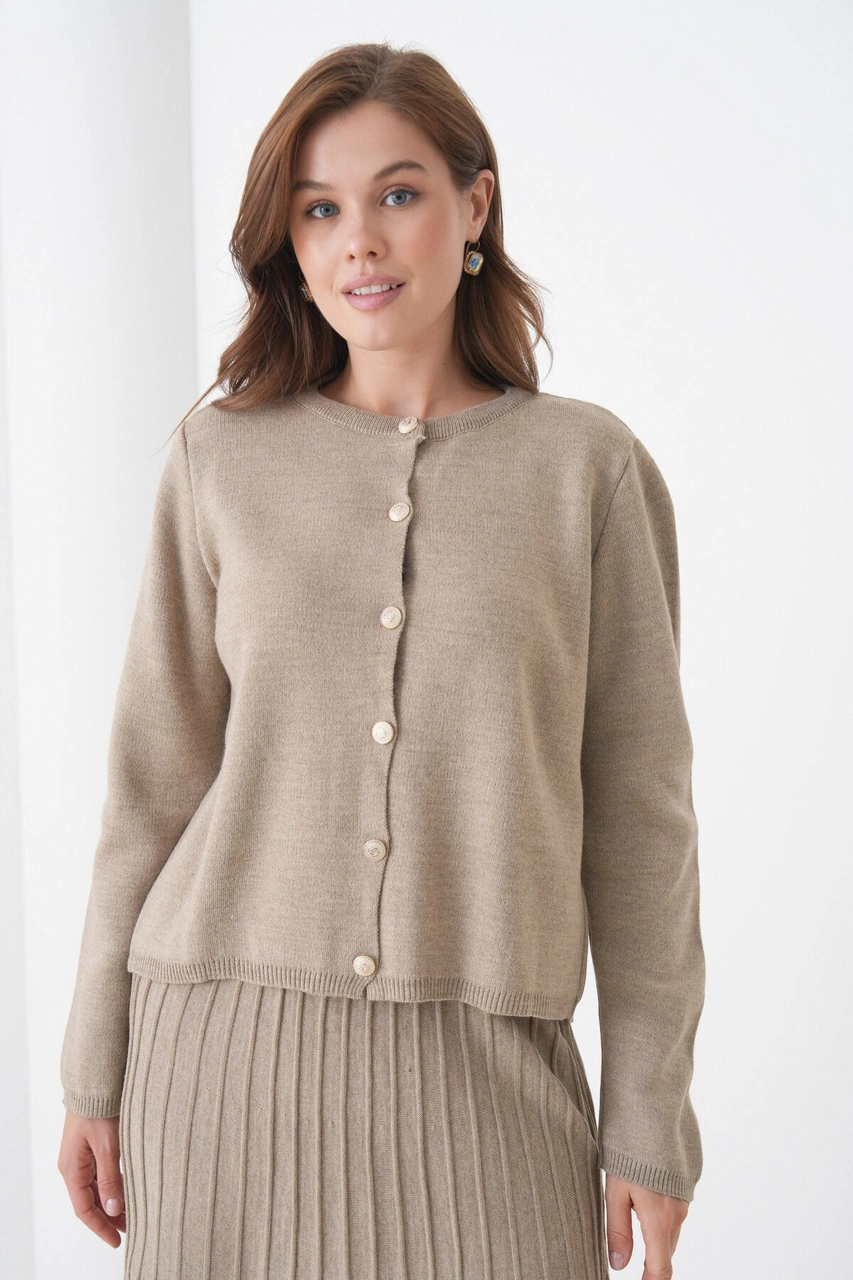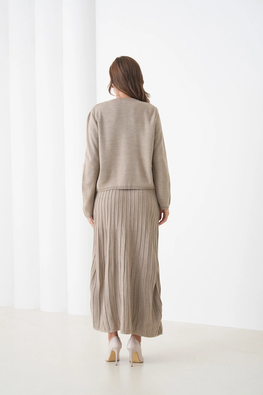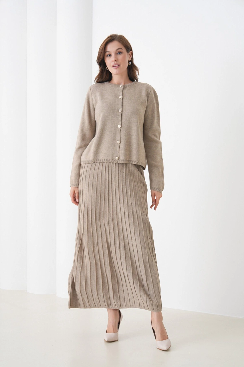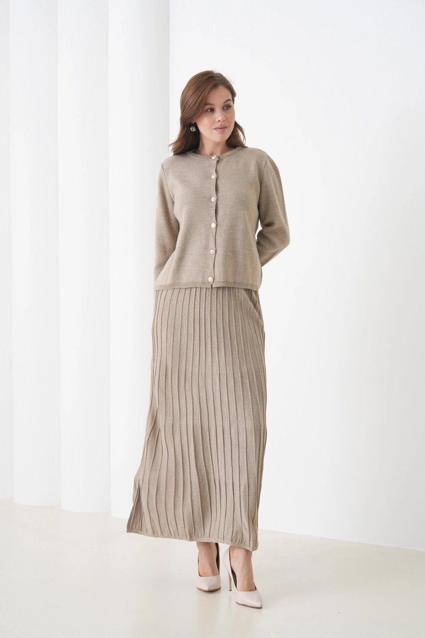 Kadın Pileli Etek Kazağı Düğmeli Tesettüre Uygun Örgü Triko Etekli Ceket Takım Vizon